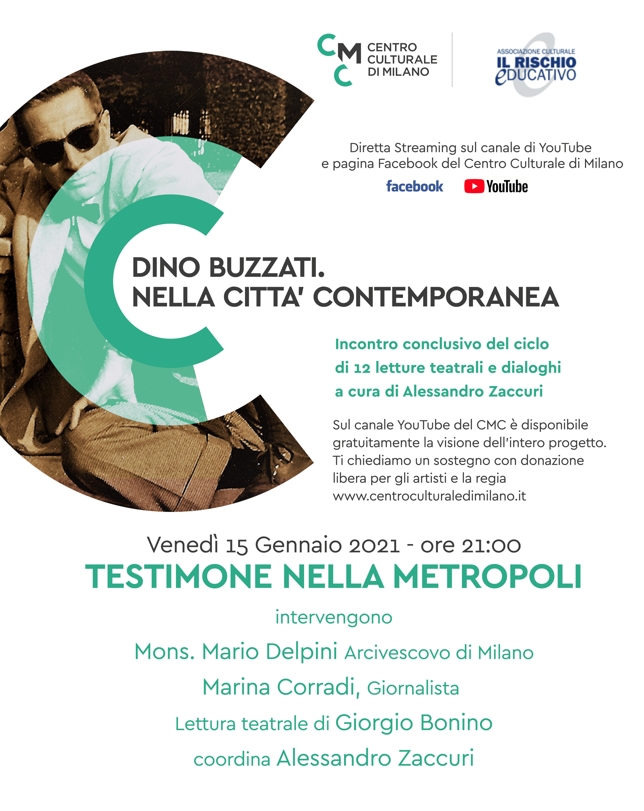 «Testimone nella metropoli» è il tema dell’incontro dedicato a Dino Buzzati, che avrà luogo venerdì 15 gennaio, alle 21, in streaming sul canale YouTube e sulla pagina Facebook del Centro culturale di Milano, che ne è promotore insieme all’associazione culturale «Il rischio educativo». L’Arcivescovo di Milano monsignor Mario Delpini e la giornalista Marina Corradi intervengono insieme al coordinatore Alessandro Zaccuri, con lettura teatrale di Giorgio Bonino.