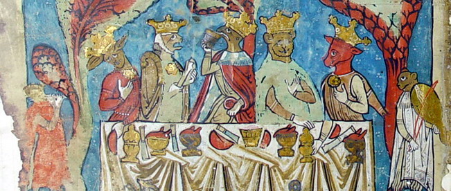 A un convito mitologico, dell’antichità classica, fa riferimento invece il frammento di un codice pergamenaceo risalente a oltre 1500 anni fa e confezionato probabilmente ad Alessandria d’Egitto, dove il testo dell’Iliade appare intervallato da straordinarie scene miniate (è la celebre Ilias Picta, uno dei manoscritti illustrati più antichi giunti fino a noi). Riferendosi a un passo del poema omerico, infatti, Ares, Zeus, Era, Atena e Afrodite sono raffigurati distesi sui triclini, mentre Efesto serve loro una coppa di vino e Apollo suona la cetra, accompagnato dalle Muse.