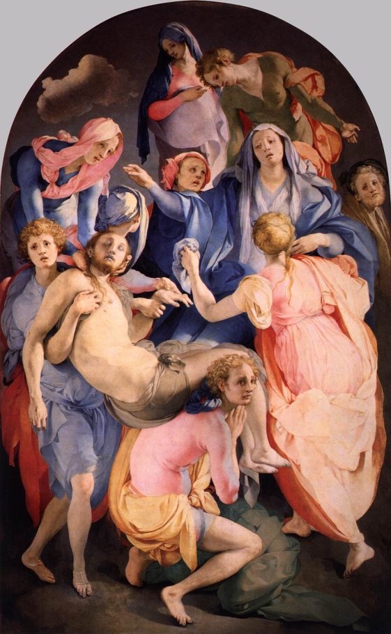 I turisti che entrano nella chiesa fiorentina di Santa Felicita (non moltissimi per la verità) lo fanno quasi esclusivamente per questo capolavoro: una Deposizione senza croce, che per questo può essere letta anche in modo molto diverso. È un corpo che si lascia andare per essere accolto. È il Corpo di Cristo che si dona all’umanità: è l’Eucarestia.