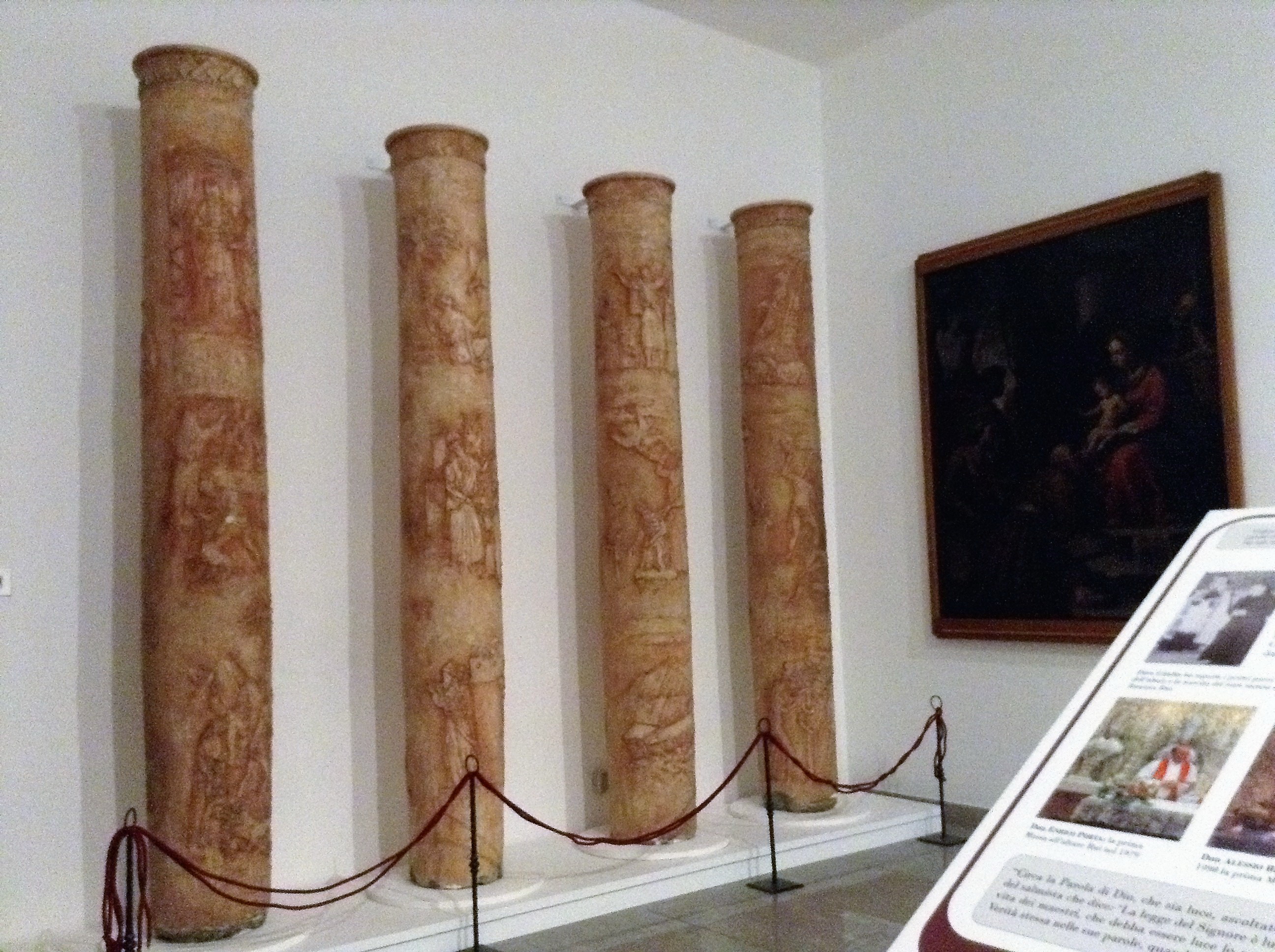 I primi tentativi vengono realizzati con altari di legno dietro i quali si cercano soluzioni estetiche e liturgiche di vario esito: quattro colonne rivestite in terracotta con le storie della Bibbia, ad esempio, che sono presenti in mostra, o un velario i cui colori seguivano i tempi dell’anno liturgico. La mensa approda presto ad un’opera d’arte realizzata da Romano Rui: quattro facciate in ceramica vetrificata con storie del Vangelo e, sopra queste, una lastra in marmo per la celebrazione dell’eucaristica su cui è rappresentato il corpo di Cristo deposto nella tomba.