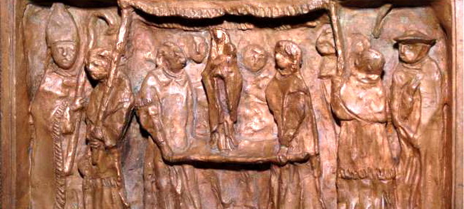 Nelle sale del Museo di corso di Porta Ticinese, così, i visitatori potranno ammirare capolavori contemporanei d’arte sacra. Come le quattro formelle bronzee di Luciano Minguzzi raffiguranti episodi della storia del Duomo di Milano, presentate dall’artista nel 1950 come bozzetti preparatori nel concorso per la quinta porta della cattedrale: concorso che effettivamente Minguzzi vinse, ex aequo con Lucio Fontana (che però preferì abbandonare l’impresa, per incomprensioni con la commissione), portando a compimento l’opera quindici anni più tardi.