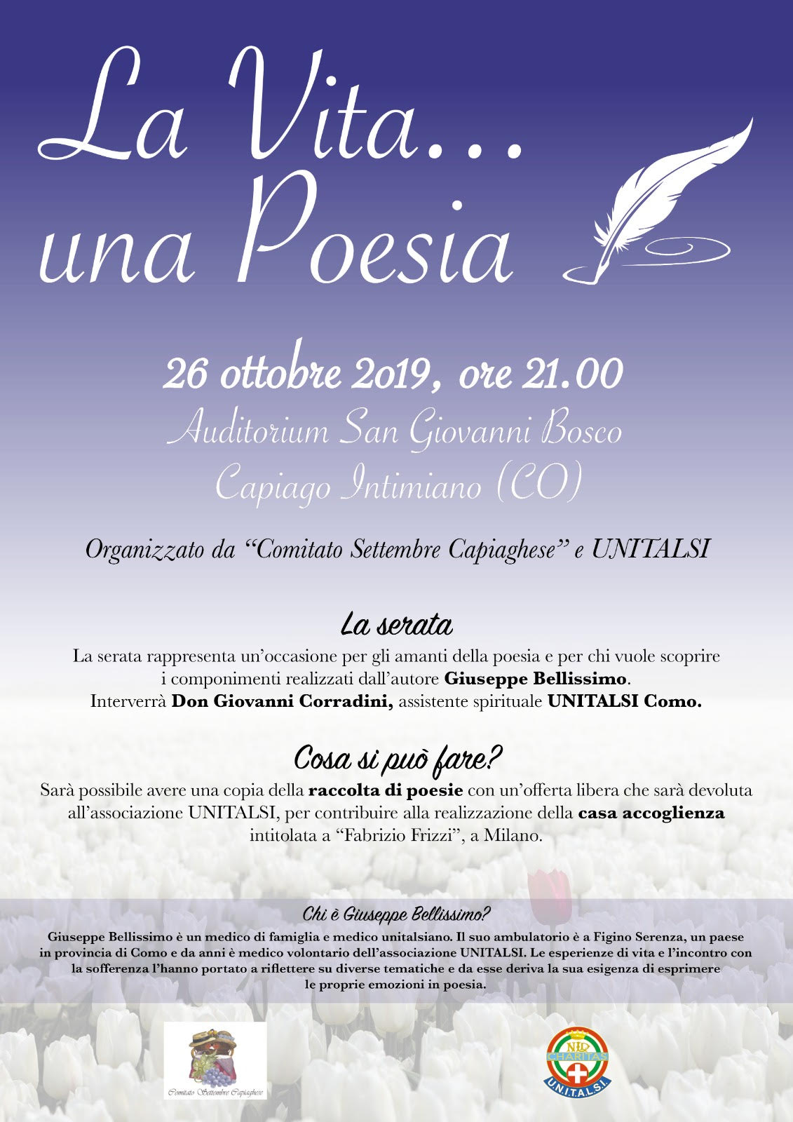 Sabato 26 ottobre, alle 21, presso l’Auditorium San Giovanni Bosco a Capiago Intimiano (Como), per iniziativa del “Comitato Settembre Capiaghese” e della sottosezione di Como dell’Unitalsi, sarà presentata la raccolta Poesie e riflessioni di un medico di famiglia, di Giuseppe Bellissimo, medico di famiglia e unitalsiano, con ambulatorio a Figino Serenza (Como). Da anni è medico volontario dell’Unitalsi e le esperienze di vita e l’incontro con la sofferenza l’hanno portato a riflettere su diverse tematiche e da esse deriva la sua esigenza di esprimere le proprie emozioni in poesia.