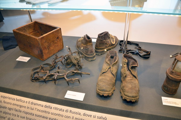 Tra le tappe principali non possono mancare i ricordi dell’esperienza bellica al fianco dei soldati, prima in Grecia e in Albania e poi in Russia, dove, facendo i conti con la dimensione del male, don Gnocchi maturò la sua personale “conversione”, decidendo di spendersi a favore degli ultimi. Scarponi, guanti, ramponi, il cappello da alpino e altri oggetti raccontano della sua esperienza nell’inferno bianco.