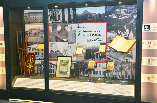 Poi le foto e le testimonianze della sua seconda, e definitiva, “carriera”. Il racconto di come don Carlo rispose all’invito dei vescovi che, nell’immediato dopoguerra, chiedevano di «far risuonare l’ora della carità», aprendo il primo centro per ragazzi mutilati in una villa di Arosio (Como), dove accolse il primo bambino mutilato affidatogli da una madre disperata. Una missione di carità nella quale don Carlo fu pioniere e innovatore, concependo i suoi collegi con una metodologia nuova, tesa non solo alla cura fisica, ma anche alla maturazione intellettuale, affettiva e ricreativa dei ragazzi. «Aprì i recinti in cui era chiusa la scienza medica, la vestì di carità e giustizia», si spiega nel percorso del Museo. Ecco quindi il quaderno del “Campo d’agosto” organizzato nel 1953 per l’infanzia mutilata europea (a Roma e Salerno parteciparono oltre cento ragazzi provenienti da tutta Europa), oppure le foto di una partita di calcio tra ragazzi invalidi vestiti con le maglie del Torino e della Juventus o, ancora, la visita dei mutilatini a Pio XII.