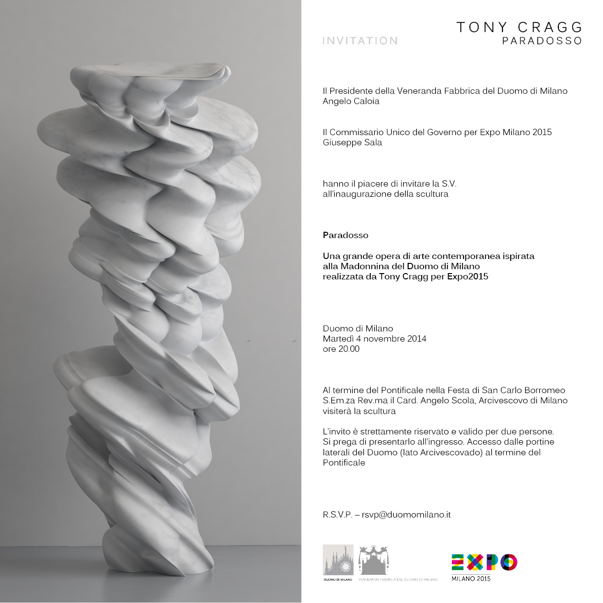L’opera sarà inaugurata e visitata dal cardinale Angelo Scola, Arcivescovo di Milano, al termine del Pontificale del 4 novembre, alle 20: una speciale anteprima della grande mostra monografica di Tony Cragg che sarà allestita nel 2015 per raccontare l’energia del marmo e il suo rapporto con il Monumento dal punto più suggestivo e affascinante della città dell’Expo: le Terrazze del Duomo di Milano.
