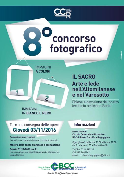 È dedicata al “sacro” l’ottava edizione del concorso fotografico della Bcc di Busto Garolfo e Buguggiate. Organizzato dal Circolo Culturale e Ricreativo della banca, il concorso vuole valorizzare il territorio dove opera la Bcc facendo leva sulla passione per la fotografia che molti coltivano. Il tema è: “Il sacro – Arte e fede nell’Altomilanese e nel Varesotto: chiese e devozione del nostro territorio nell’Anno Santo”.