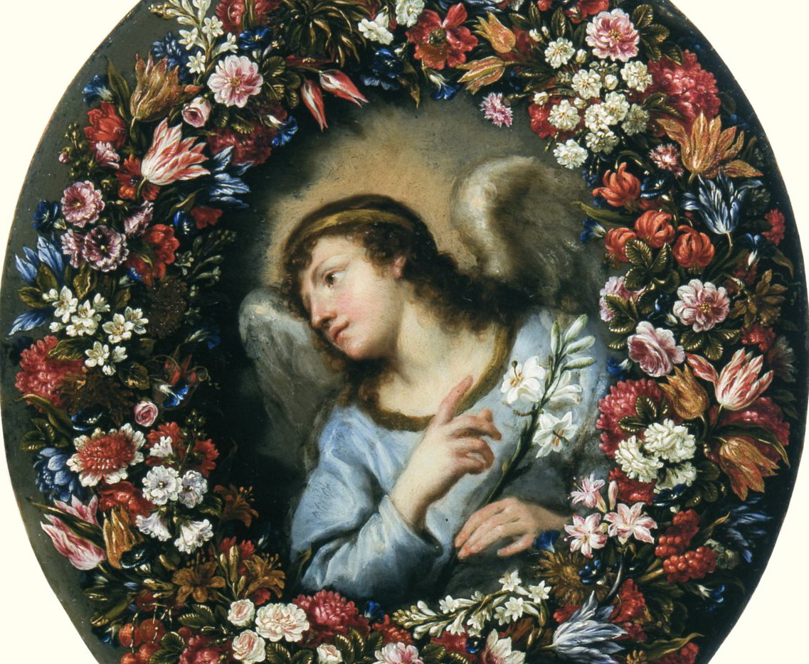 Anche il volto di Gabriele riverbera come una bellezza sovraterrena. E il suo sguardo si fa tenera contemplazione di colei, fra tutte le donne beata, che da sempre è stata prescelta da Dio per generare il suo unico Figlio. Con una mano indica il cielo, con l’altra stringe un giglio, simbolo di purezza, emblema di elezione. Fiore che sembra tolto dalla corona che circonda l’arcangelo stesso, lui come la Madonna, trionfo di petali, di corolle e di foglie, tripudio di colori non soltanto da ammirare, ma come da annusare, inebriandosi di profumi. Sono, quei fiori, le gemme naturali del Creato, il tocco più gentile della potenza generatrice del Padre. Così che ad ognuno di essi, in un gioco di rimandi e d’arguzia, secondo l’insegnamento dei commentatori medievali, può essere riconosciuta un’allusione simbolica, una virtù di Maria.