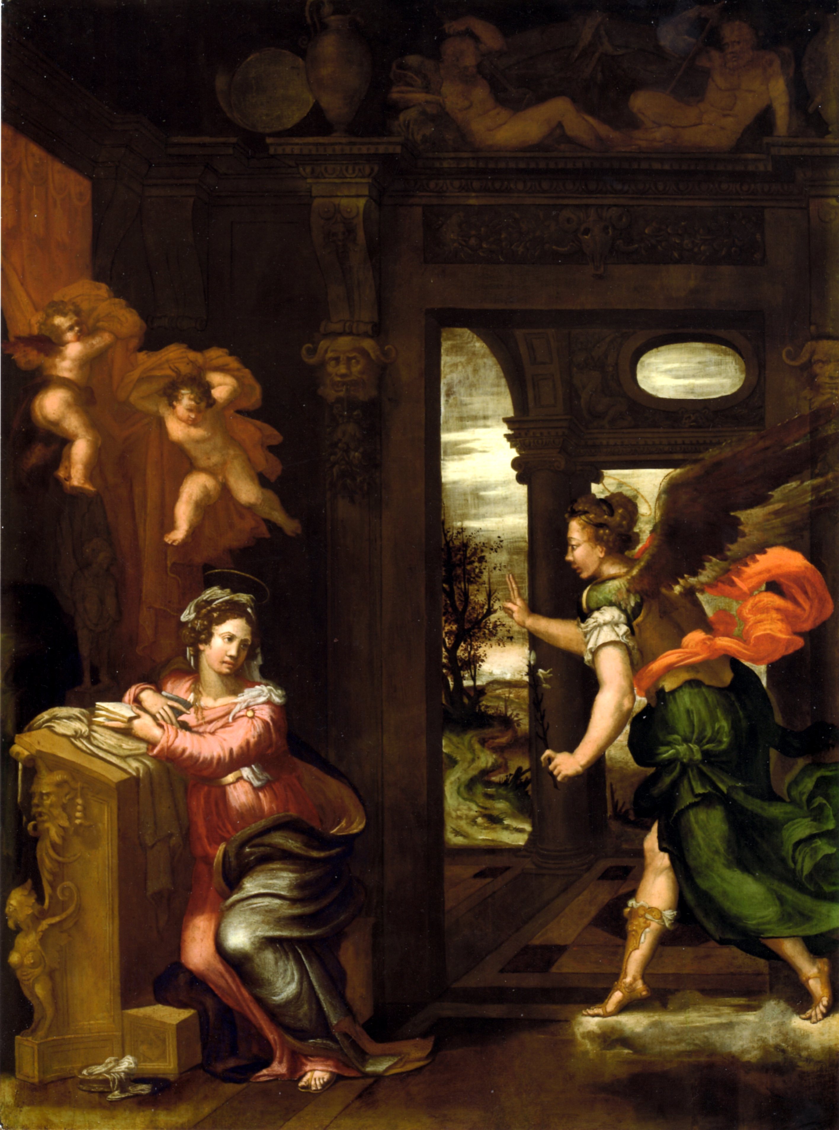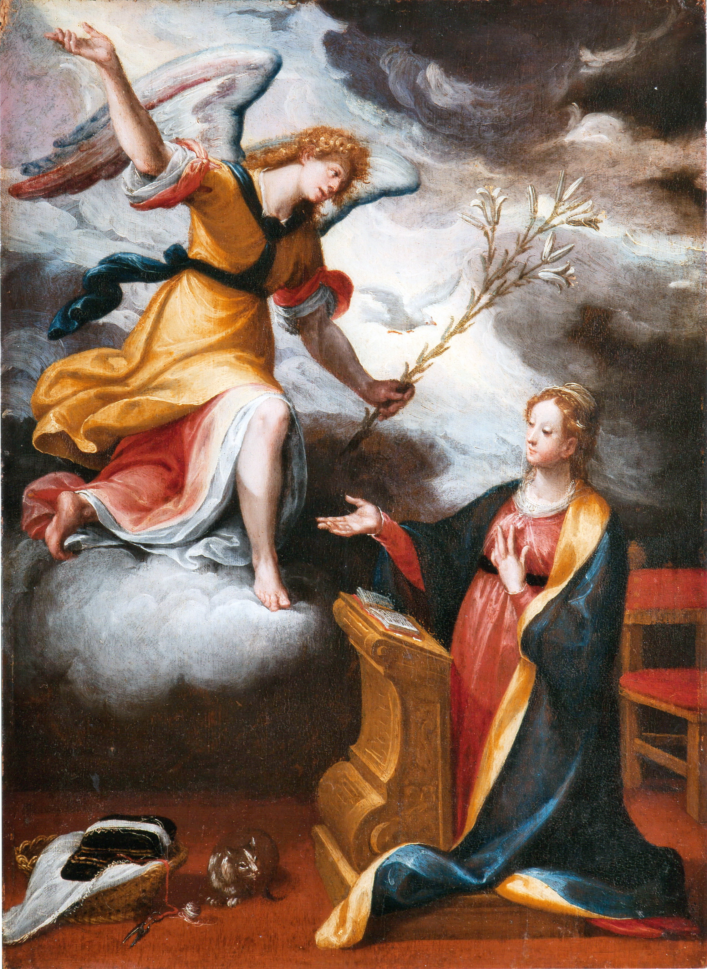 O ancora come si vede nello smagliante olio su rame assegnabile all’entourage di Denys Calvaert – pittore di Anversa capace di unire lo stile fiammingo con il gusto italiano, nella cui bottega bolognese si formarono futuri maestri come il Domenichino o Guido Reni -, in cui le nubi del cielo, ovvero la presenza stessa di Dio, scendono a saturare la dimora terrena di Maria, metafora nella metafora.