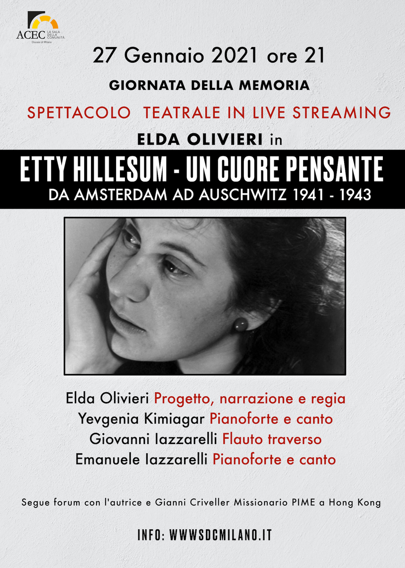 Dieci teatri delle Sale della Comunità insieme per ricordare che la vita è più forte della morte. Mercoledì 27 gennaio, alle 21, i siti web di 10 teatri, chiusi da mesi a causa dell’emergenza Coronavirus, riapriranno il loro sipario in forma virtuale, ospitando lo spettacolo Etty Hillesum – Un cuore pensante. Da Amsterdam ad Auschwitz 1941-1943, di e con Elda Olivieri. L’attrice sarà affiancata da tre musicisti – Yevgenia Kimiagar (pianoforte e canto), Giovanni Iazzarelli (flauto traverso) ed Emanuele Iazzarelli (pianoforte e canto), che porteranno all’interno della storia di una donna straordinaria. Lo spettacolo verrà corredato da immagini di repertorio e sarà seguito da un forum con l’autrice e Gianni Criveller, missionario del Pime ad Hong Kong.