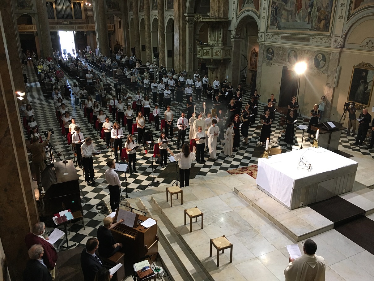 Al termine della Messa è stato quindi proiettato per i fedeli presenti in Basilica il video (realizzato da Mauro Amati) con i contributi dei Cori partecipanti da remoto : Licabella de La Valletta Brianza (Italia, M. Floranna Spreafico), Atlantic Boys & Men’s Choir (Canada, M. Jakub Martinec), Hägerstens Gosskör Svenskakyrkan (Svezia, M. Pelle Olofson), Jitro (Repubblica Ceca, M. Jiri Skopal), Les Voix de Choristes (Francia, M. Nicolas Porte), Traditsiya (Russia, M. Irina Charnetskaya) e Warsaw Boys & Men’s Choir (M. Jakub Michal Hutek).