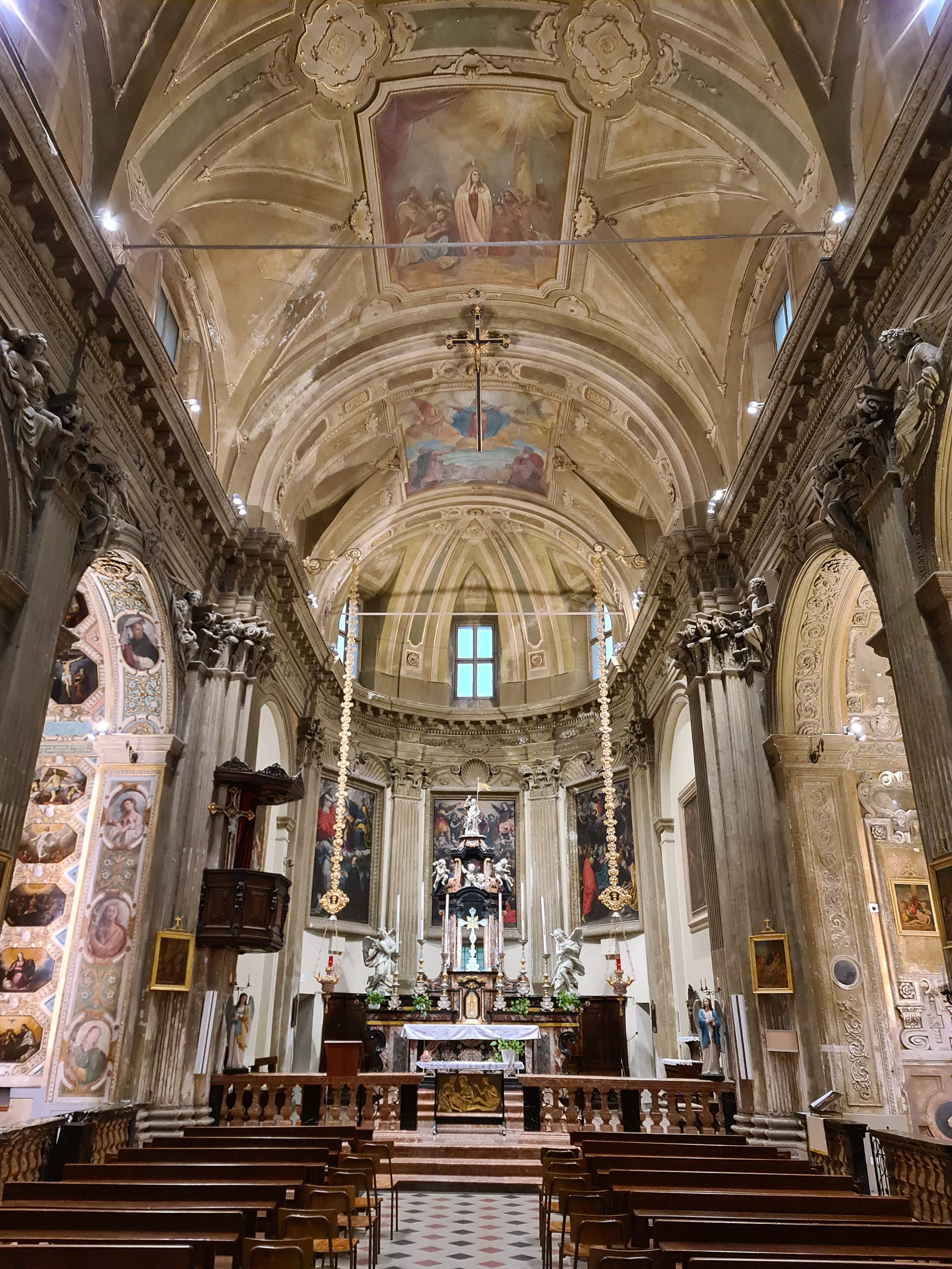Nel presbiterio, infatti, campeggiano tre grandi tele a tema mariano: la «Morte della Vergine», la sua «Assunzione» e la sua «Incoronazione» a opera della Trinità. Si tratta di un «trittico» del quale è nota sia la committenza, sia la data di esecuzione (1606): informazioni che sono riportate in un’iscrizione presente sull’ultimo quadrone. Ancora da individuare, invece, è l’autore di questi dipinti, che appare comunque vicino allo stile e ai modi di Giovanni Ambrogio Figino, ovvero una delle maggiori personalità artistiche nella Milano a cavallo tra XVI e XVII secolo.