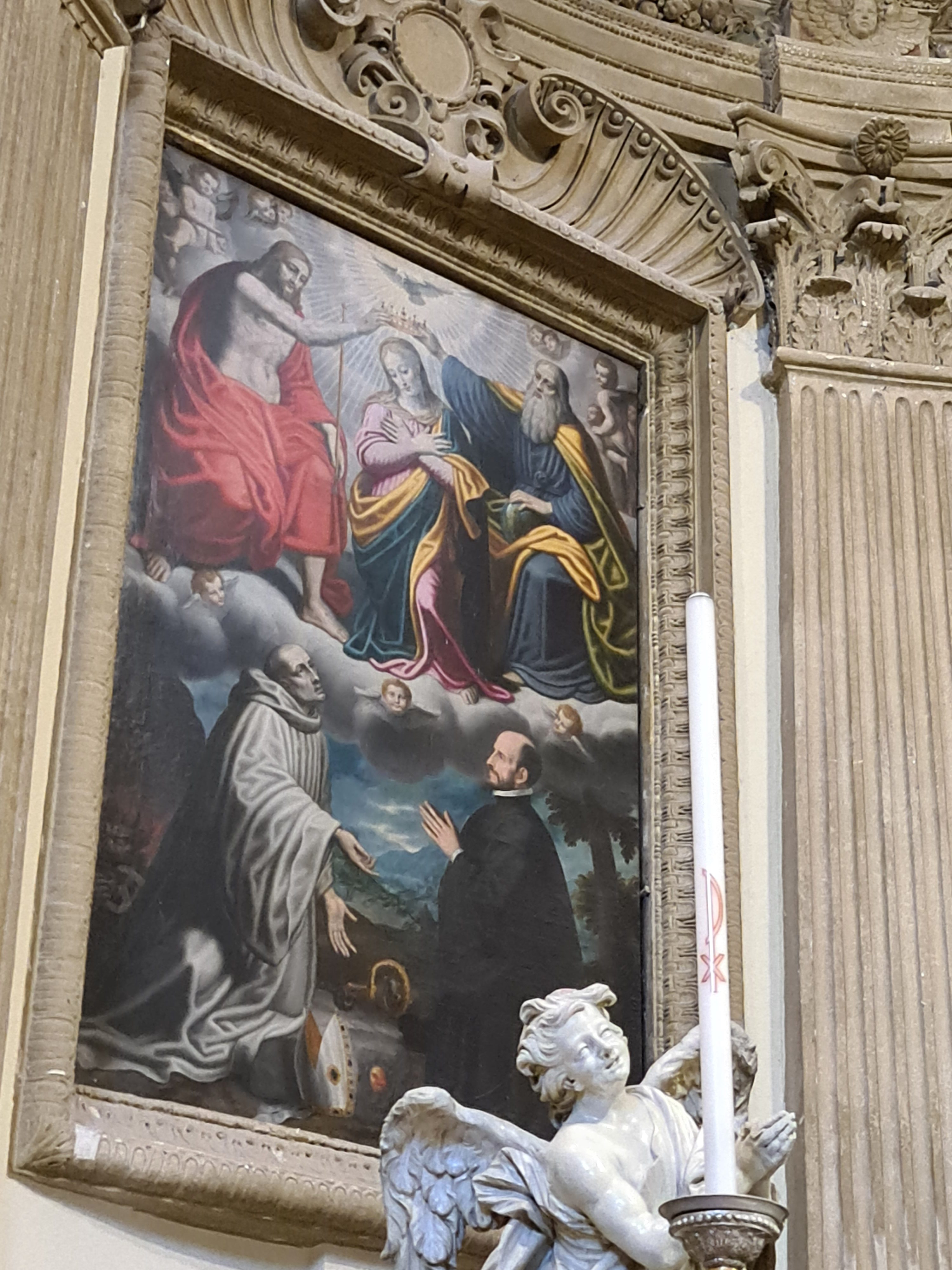 L’«Incoronazione», come ormai ci aspettiamo, mostra analogie con la produzione del Figino, senza tuttavia eguagliarne il livello (come emerge, immediatamente, dal confronto con la tela di identico soggetto ora in San Fedele a Milano). Ai piedi della Vergine e della Trinità si prostra in adorazione san Bernardo di Chiaravalle (si noti alle sue spalle il demonio incatenato, come vuole l’iconografia tradizionale), grande dottore della Chiesa e soprattutto «tenero cantore di Maria».