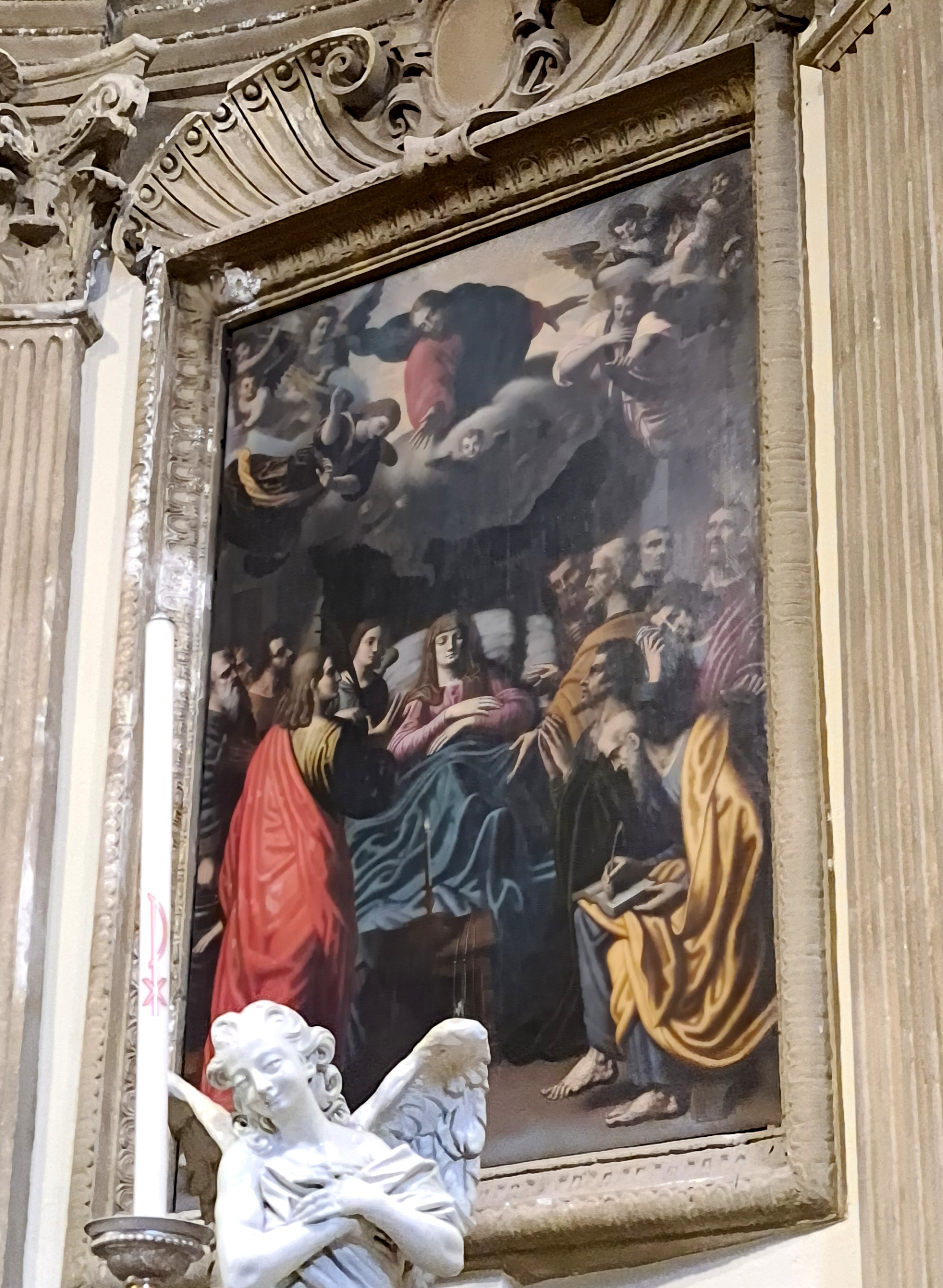Certo fa impressione pensare che proprio mentre il nostro anonimo pittore realizzava questa tela per la chiesa del Vigentino, a Roma un tale Michelangelo Merisi detto il Caravaggio stava lavorando alla sua «Morte della Vergine»: uno straordinario capolavoro che, per la sua impostazione ardita e tormentata, avrebbe suscitato molti clamori, tra ammirazione e perplessità, fino al punto di essere rifiutata dai committenti. Al suo posto, in Santa Maria della Scala, com’è noto, verrà posta una pala eseguita da Carlo Saraceni, più «normale» e «tranquilla»: proprio come questa milanese, appunto!