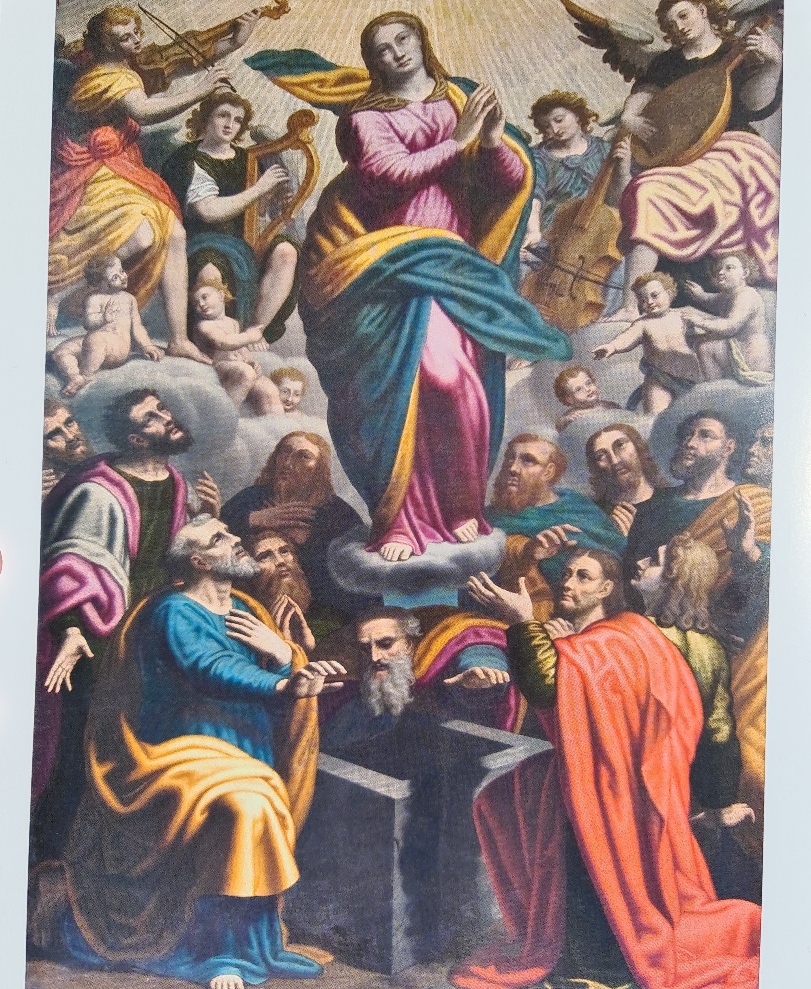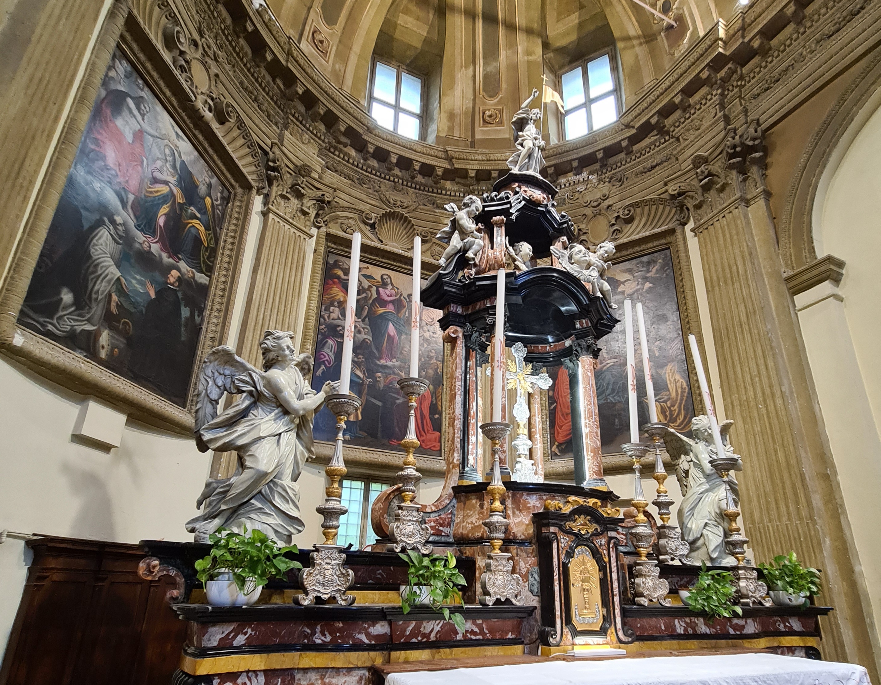 Pur cambiando la scena, anche l’«Assunzione» mostra la medesima impostazione nel solco della pittura del Figino, seppur con una cromia ancora più vivace, così che si può pensare a un suo allievo o a un suo collaboratore, come Carlo Cane da Trino, ad esempio, secondo la proposta di Andrea Spiriti. La figura della Vergine che ascende al cielo, tra gli angeli musicanti che paiono un omaggio al celebre «coro» affrescato da Gaudenzio Ferrari nella cupola del santuario di Saronno, rivela sua derivazione diretta dal modello statuario di Annibale Fontana, il più acclamato scultore della fine del Cinquecento, il cui capolavoro si trova in Santa Maria dei Miracoli presso San Celso (all’epoca in cima alla facciata, ora al riparo nel coro).