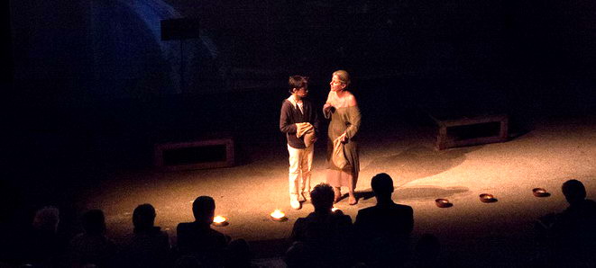 Non c’è, lo si vedrà solo alla fine, per un attimo. In scena, attraverso videoproiezioni, si vedono i luoghi in cui Martini ha vissuto, in particolare Gerusalemme e Milano, e riecheggiano le sue parole attraverso le voci di Giovanni Crippa, Lucilla Giagnoni e di un ragazzino (Giovanni Antonio Cappa, figlio del regista, ndr) a testimoniare il passaggio di consegne del suo pensiero alle nuove generazioni.