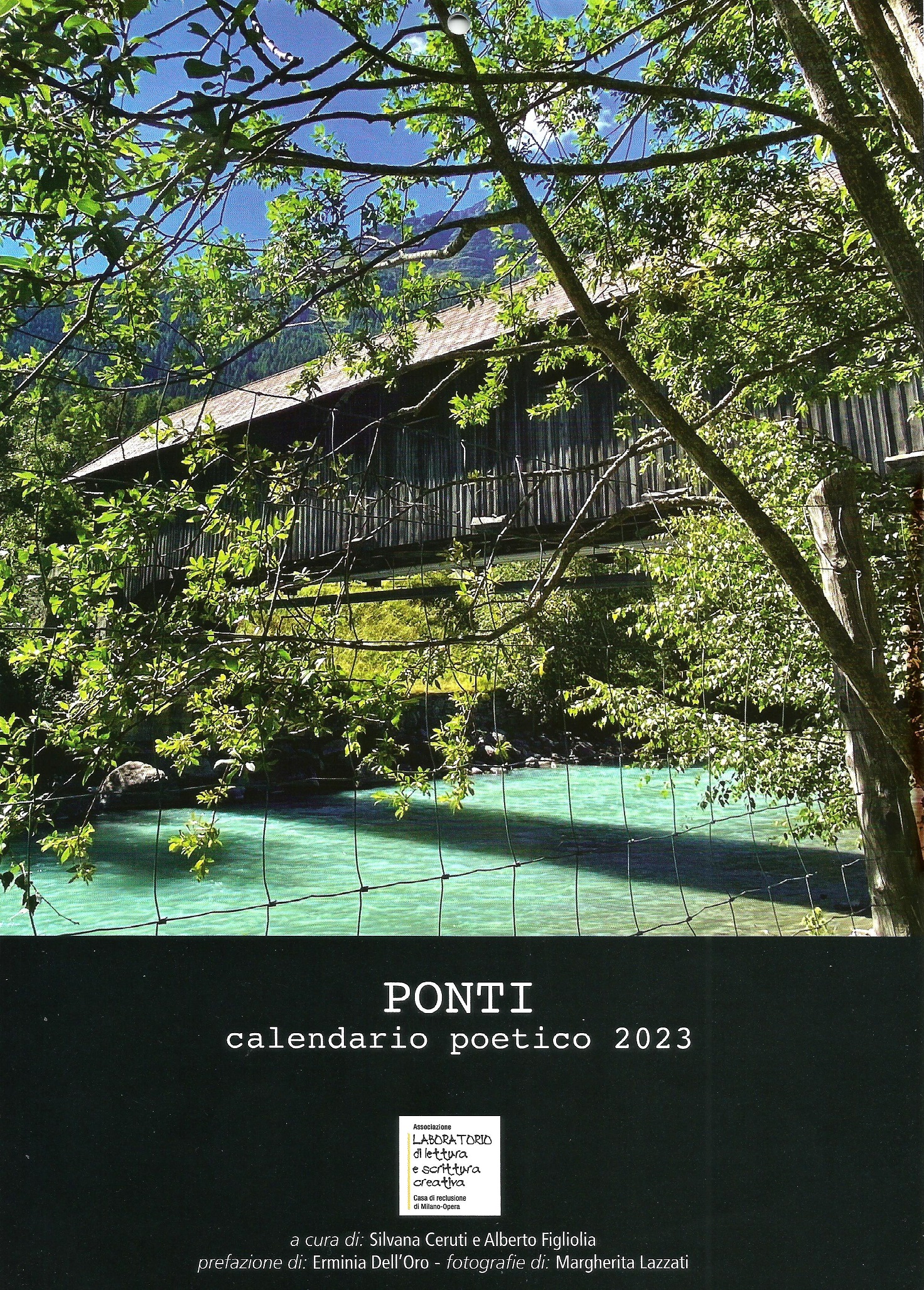 Anche per il 2023 il Laboratorio ha pubblicato il calendario poetico, intitolato appunto «Ponti» e illustrato da 15 straordinarie fotografie di Margherita Lazzati. C’è bisogno di costruire ponti con la vita. Per Erminia dell’Oro – che ha collaborato al calendario – «Pontefice» è «colui che dovrebbe costruire simbolicamente ponti per l’unione dei popoli, delle religioni, delle diversità, come tenta di fare papa Francesco con i suoi disperati appelli ai fautori delle guerre». Uno dei primi passi verso la pace è l’incontro, non lo scontro, tra le persone. Il ponte lo favorisce, lo scontro lo frantuma.