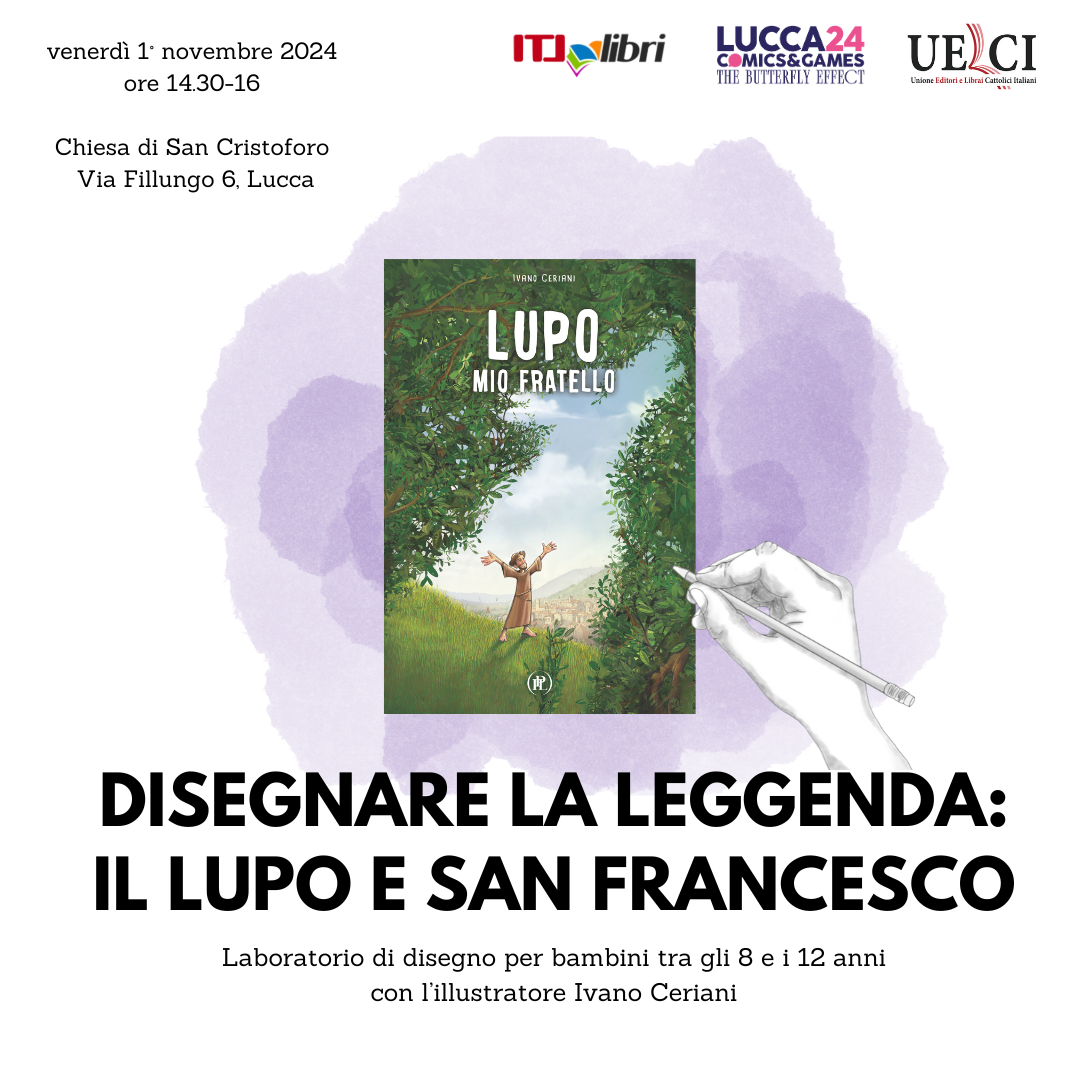 In occasione di Lucca Comics & Games 2024, Itl Libri, in collaborazione con Uelci, propone un appuntamento ai più giovani, «Disegnare la leggenda: il lupo e San Francesco»: un laboratorio di disegno che si terrà presso la suggestiva cornice della chiesa di San Cristoforo, nel centro storico della città, venerdì 1 novembre dalle 14.30 alle 16 (vedi qui la locandina).