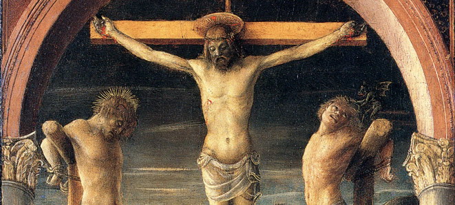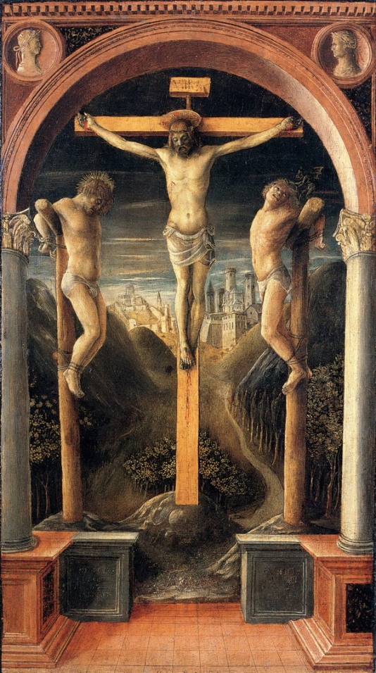 Un arco di ispirazione classica, ripreso da modelli padovani, introduce la scena e si spalanca su un paesaggio cupo e solo apparentemente incantato, di sapore ancora tardogotico, in cui le torri e le mura di una Gerusalemme reinventata conducono lo spettatore fino all’orizzonte vibrante di una luce metallica. Un vero e proprio manifesto, insomma, di una nuova concezione spaziale prospetticamente articolata, eppure coinvolgente, emozionante, con quel Cristo ingrandito rispetto alle leggi matematiche delle proporzioni, il buon ladrone già illuminato dalla grazia divina, il cattivo tormentato da un diavolo che gli si attacca ai capelli ricciuti.