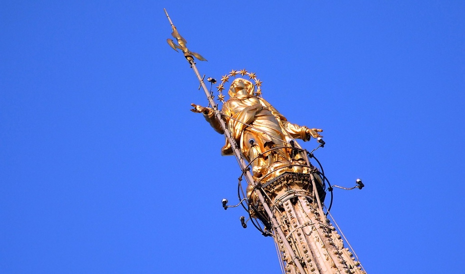 La Madonnina, si sa, è il simbolo stesso della città di Milano: un’immagine cara e notissima, anche ben al di là dei confini ambrosiani. Quello che forse non tutti sanno, invece, è che la grande statua che si innalza sulla guglia più alta del Duomo non è una “generica” raffigurazione di Maria, ma proprio un omaggio alla Vergine Assunta. Il fatto non è casuale, ovviamente: è un riferimento preciso, infatti, alla dedicazione con cui venne iniziata la nuova cattedrale, titolo poi mutato nel Seicento in quello di «Maria Nascente», che tutt’oggi compare sulla facciata napoleonica.