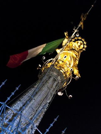 La grande e celebre statua, infatti, ideata dallo scultore Giuseppe Perego ed eseguita in lastre di rame dall’orafo Giuseppe Bini (infine dorata a mordente dal pittore Anton Raphael Mengs, uno dei padri del neoclassicismo), è alta oltre quattro metri e pesa poco meno di una tonnellata. Fu issata sulla guglia maggiore del Duomo il 30 dicembre 1774 e da allora, sfidando fulmini e intemperie, guerre e bombardamenti, non ha mai cessato di vegliare su Milano e sui milanesi a più di cento metri d’altezza.