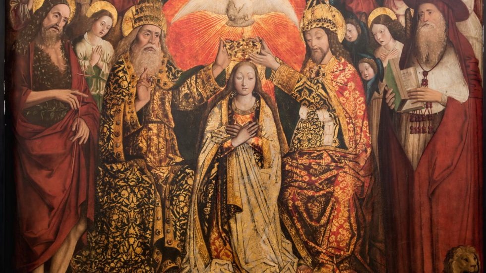 Al centro della scena vi è Maria, in ginocchio, le mani incrociate sul petto in quel gesto di umile e docile obbedienza alla volontà divina che già aveva professato nel momento dell’annuncio dell’arcangelo Gabriele. Come allora, sulla testa della fanciulla, per sempre “piena di Grazia”, ancora una volta discende lo Spirito Santo in forma di colomba, mentre la Vergine sta per essere incoronata dal Padre, a sinistra per chi guarda, e dal Figlio. L’Eterno alza la mano destra nel gesto di benedizione; Gesù, invece, usa entrambe le mani per porre la corona sul capo di Colei che è al contempo sua madre e sua sposa, guardandola con affetto e ammirazione: quasi con emozione, verrebbe da dire. Anche lui calza una corona principesca, ma indossa soprattutto il pallio del supremo ed eterno sacerdote.