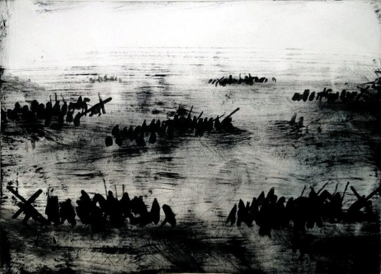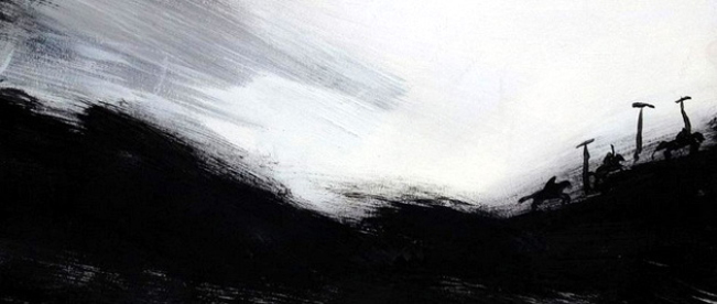 Anche la terra sussulta, indignata, presa da orrore per l’uccisione del Giusto. E la strada che conduce al Golgota diventa una lingua di lava, mentre la collina s’increspa, quasi eruttando lapilli e ceneri. In cima le tre croci, in basso un corteo di uomini e animali, donne e soldati, formiche impazzite in un mondo senza più riferimenti, sommerso ormai dalle tenebre della paura, del dolore, del tradimento…