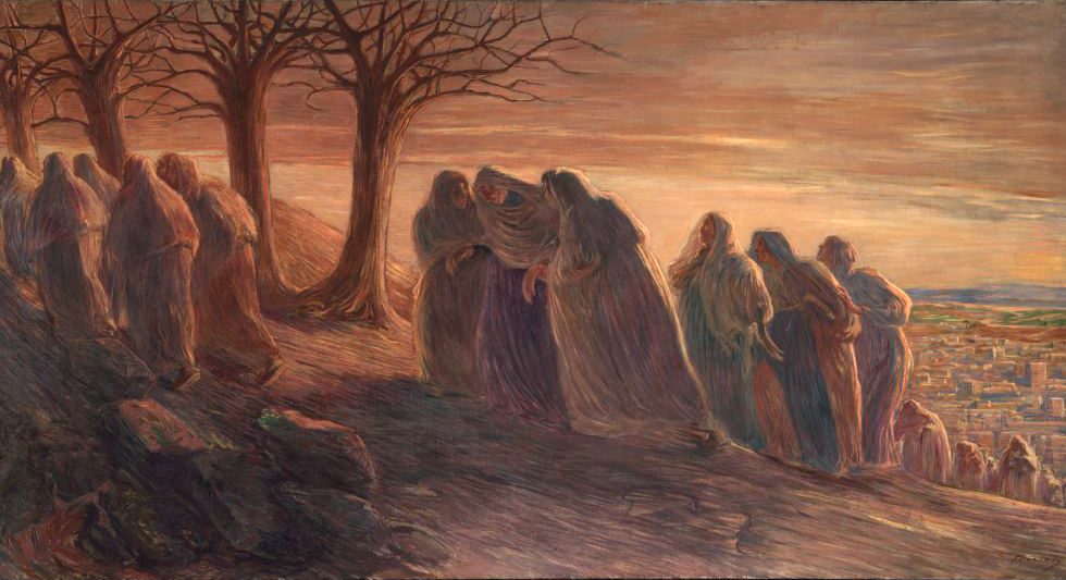 Salgono le donne sul Golgota, piegate dalla sofferenza, schiacciate dalla tristezza. Aggrappate le une alle altre come naufraghi in un fiume di dolore, dove scorrono stille di pianto, lacrime di sangue: il sangue versato dall’agnello condotto al macello, le lacrime sparse per l’innocente straziato. Cerca il Nazareno, il nostro sguardo, ma non lo trova. Cerca il legno della croce, ma non lo vede. Incontra invece lei, Maria, la Madre avvolta dalle doglie dell’angoscia più grande, per quel Figlio che le stanno uccidendo. E il cielo tra gli alberi scheletrici già si tinge di porpora, mentre le case di Gerusalemme, là sotto, si confondono tra le ombre…