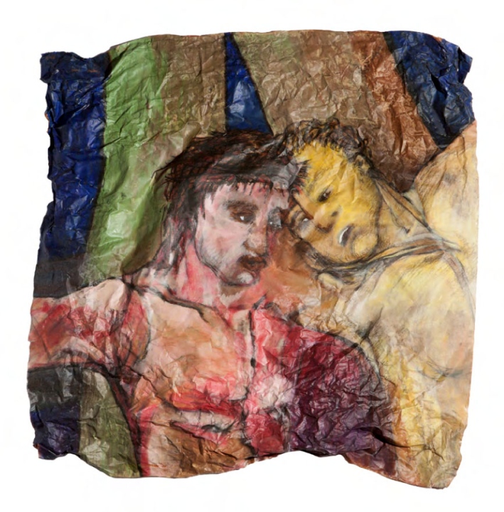 Raffaella Surian, infatti, abbandona l’astrazione che aveva caratterizzato la sua precedente cifra espressiva, collocandosi nell’alveo della pittura figurativa. Proprio il ricorso all’immagine rende la narrazione più calda e appassionata. L’artista, in questo modo, si cala nel dolore della Via Crucis e se ne appropria, interpretandolo di volto in volto, toccandolo con le mani mentre accartoccia la carta perché prenda forma e diventi scultura.