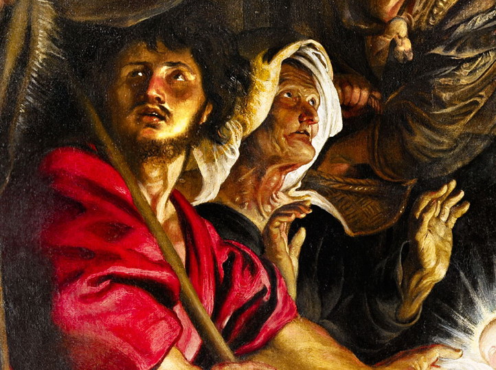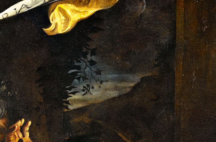 Al centro una vecchia rugosa con la testa coperta da un panno bianco, anch’essa raggiunta dalla luce chiara che attonita esprime la sua meraviglia con le mani aperte, dipinte con meravigliosa destrezza naturalistica.