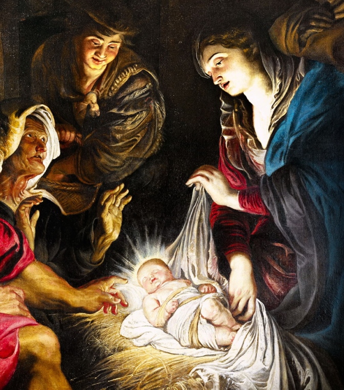 La grande tela celebra uno dei momenti più intimi e suggestivi della Natività, secondo la narrazione del Vangelo (Luca 2, 8-16) con una composizione dipinta a luce notturna, densa di bagliori in cui si stagliano le monumentali figure della Vergine, chinata leggermente verso il Bambino su cui volge lo sguardo amorevole. Le sue mani si incrociano con grazia, con stupenda invenzione, a scoprire il piccolo corpo di Gesù, che rivela così ancora di più la luce abbagliante e chiarissima che investe tutta la composizione.
