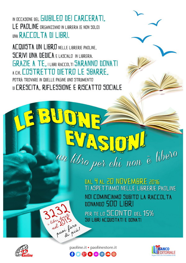 Volutamente provocatorio lo slogan dell’iniziativa. “Le buone evasioni” indicano il libro, cibo della mente e del cuore che, donato a chi è in carcere, può essere un modo per indicare orizzonti di libertà e di dignità che vanno al di là dei confini di una cella. Oltre che un segno di solidarietà, per le Paoline quest’iniziativa rappresenta un contributo alla riflessione concreta sulle condizioni di vita in una di quelle “periferie esistenziali” su cui papa Francesco ha più volte esortato a porre attenzione e cura.