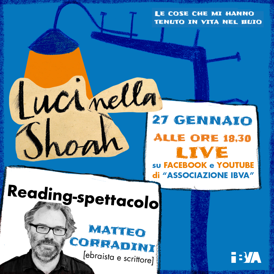Alle 18.30 sui canali Fb e YouTube dell’Ibva Corradini terrà il reading-spettacolo Luci nella Shoah: un racconto appassionato di storie vere di ebrei deportati, che nel momento più buio della propria vita, uno dei più bui della storia dell’umanità, hanno trovato il modo di resistere grazie all’attaccamento a un determinato oggetto, pensiero, ricordo.