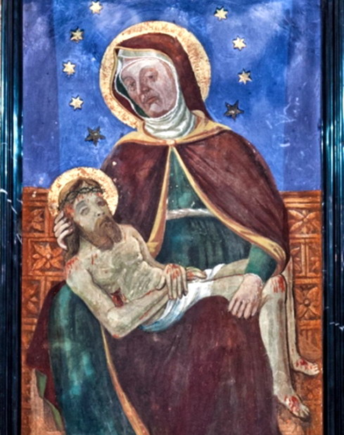 I documenti d’archivio sono precisi: nell’anno di Grazia 1562, addì 11 maggio, lunedì dopo l’Ascensione, due donne rincasando verso l’ora di pranzo vollero sostare presso la cappelletta della Vergine. Era questo un luogo campestre di serena quiete; qui un anonimo devoto, agli inizi del secolo, aveva eretto una modesta struttura sulla quale era stata dipinta l’immagine dell’Addolorata con in grembo il Figlio Gesù deposto dalla croce. L’edicola era chiamata dalla gente del posto “alla Caravina”, poiché sorgeva accanto al terreno smosso da una frana (“sgravina”, appunto), cosa non rara in queste parti. Già da tempo si mormorava piamente che questa sacra effigie fosse miracolosa, ma certo le nostre due donne mai si sarebbero aspettare di assistere a un simile prodigio: Maria piangeva e le lacrime rigavano il suo bel volto dipinto.