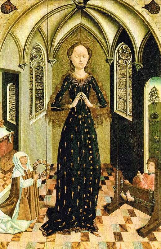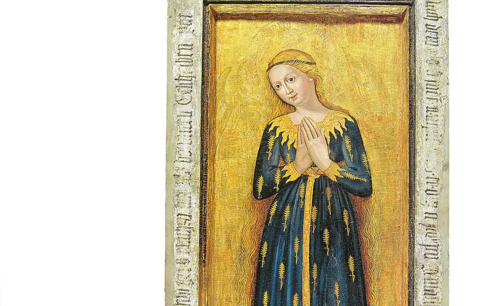 Al museo statale di Innsbruck, dedicato alla storia e all’arte del Tirolo, è conservata una tavola, alta poco più di un metro, sulla quale è dipinta una Madonna piuttosto “insolita”, almeno per quanto riguarda il panorama italiano: Maria, infatti, è raffigurata come una fanciulla sorridente, ritta in piedi, con le mani giunte sul petto nel gesto della preghiera, i lunghi capelli che scendono dietro le spalle fino quasi a terra, vestita di un abito blu adornato con dorate spighe di grano. L’opera, pregevole e graziosa, proviene dalla chiesa parrocchiale di Vipiteno, a una quindicina di chilometri a sud del Passo del Brennero, ed è databile alla seconda metà del XV secolo. Sulla cornice una scritta in tedesco e in caratteri gotici dichiara che quest’immagine è una copia fedele di quella, più grande, che si trova nel Duomo di Milano.