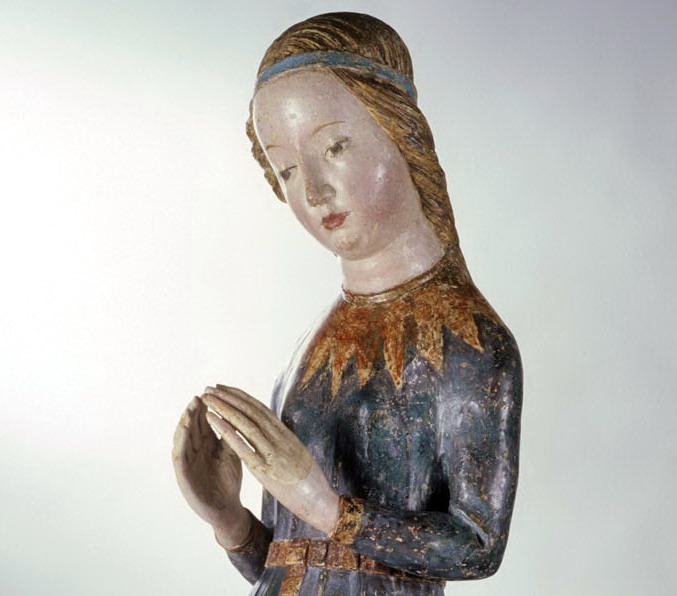 Nella cattedrale ambrosiana, tuttavia, oggi non è presente nulla del genere. Se però ci si sposta di poche centinaia di metri, nelle raccolte del Castello Sforzesco troviamo una statua in marmo a grandezza naturale che appare come la traduzione scultorea del dipinto tirolese: anche qui, infatti, abbiamo la figura di una giovane donna con le mani giunte sul petto e il vestito decorato con delle spighe. Si tratta della cosiddetta “Madonna del coazzone”, termine dialettale milanese che in passato indicava la lunga treccia che scende lungo la schiena della giovane. E quest’opera, attribuita a Pietro Antonio Solari che la realizzò tra il 1480 e il 1490, proviene proprio dal Duomo di Milano.