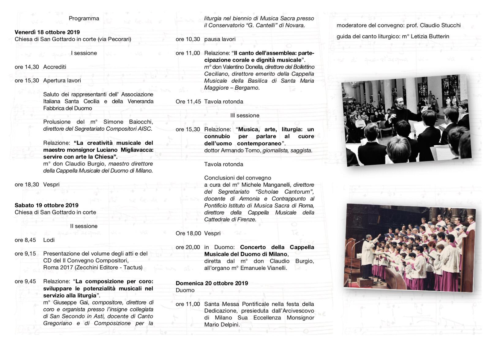 L’opera di monsignor Luciano Migliavacca (1919-2013) – eminente maestro della Cappella Musicale del Duomo di cui quest’anno ricorre il centenario della nascita – è al centro del III Convegno Nazionale Compositori di Musica Sacra, promosso dall’Associazione Italiana Santa Cecilia in San Gottardo in Corte (via Pecorari, Milano), venerdì 18 e sabato 19 ottobre (in allegato il programma).