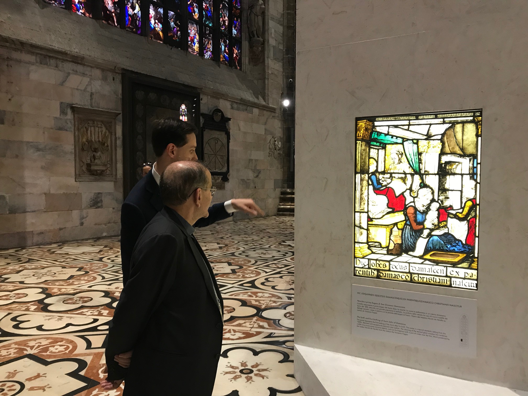 Alcuni antelli della splendida “Vetrata 25”, infatti, quella che illustra la vita di san Giovanni Damasceno, dopo essere stati restaurati e prima di essere riposizionati sopra l’altare di Santa Prassede (nel transetto settentrionale), sono ora esposti nel retrocoro del Duomo, così che fino al prossimo settembre saranno direttamente e pienamente accessibili a tutti i visitatori. Un’occasione da non perdere, se si considera l’eccezionalità di questa proposta che permetterà di poter ammirare dappresso uno dei capolavori dell’arte vetraria del XV secolo, restituito al suo originale splendore (e in questo caso nel senso più letterale dell’espressione).