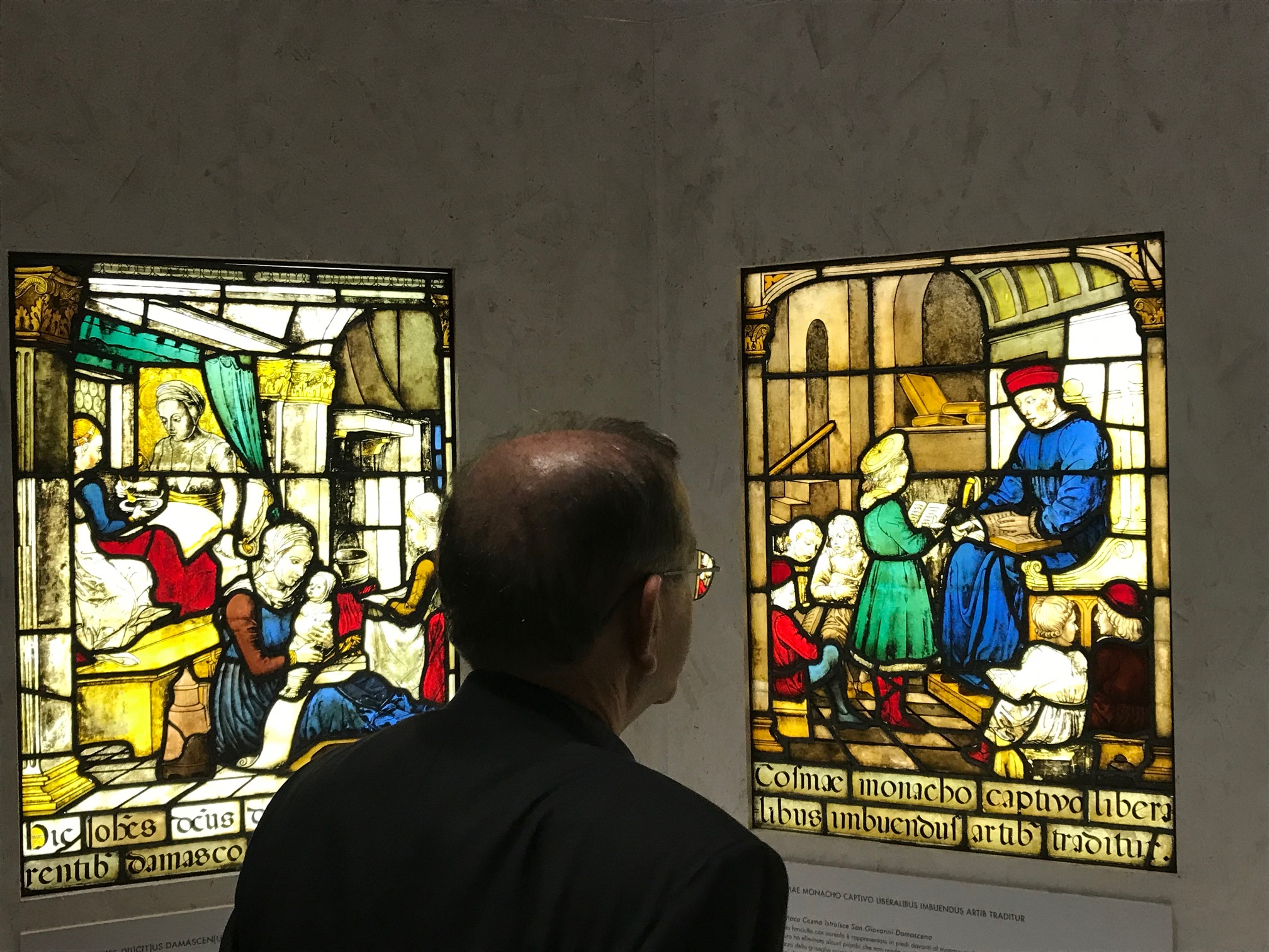 Definito “Evangelista pharmacopeorum” nei testi medievali, san Giovanni Damasceno fu quindi scelto dai farmacisti quale celeste protettore, anche se in realtà egli non si era mai occupato di medicina né di preparati farmaceutici, essendo semmai un “medico” dello spirito. È interessante notare, comunque, come nella vetrata di Niccolò da Varallo il santo di Damasco sia raffigurato più volte in un contesto di studio e di insegnamento, a evocare, evidentemente, la formazione e i continui aggiornamenti richiesti ai membri del paratico degli speziali.