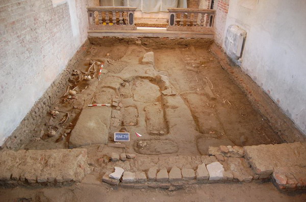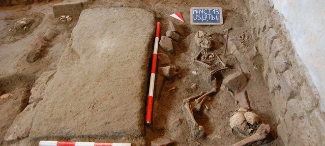 Come le diverse sepolture rinvenute nel sacro edificio, ad esempio, pertinenti a varie fasi dell’epoca medievale e che, insieme al ritrovamento di materiali ceramici rinascimentali, testimoniano una lunga e ininterrotta frequentazione del sito, almeno a partire dal XIII secolo. Particolarmente toccante è stata la scoperta di una tomba che presenta i resti di un bambino di pochi mesi adagiato su quelli di una persona adulta, con frammenti di tessuto e la deposizione simbolica di una moneta: una sepoltura che, presumibilmente, ha accolto una madre con la sua creatura, in un abbraccio oltre la morte.