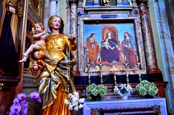 Un altro saggio della sua pittura, anche se assai rimaneggiato (o forse soltanto di bottega), lo ritroviamo nella cappella che si apre quasi di fronte al polittico, con una delicata Madonna in trono col Bambino fra sant’Eufemia e santa Caterina d’Alessandria. Affresco problematico, in realtà, perchè pervaso da un affascinante, ma in fondo non poi così insolito, sincretismo culturale che somma dettagli ancora tardogotici con un linguaggio dichiaratamente altorinascimentale…