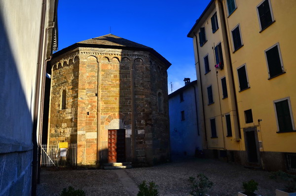 Ma le vetuste origini plebane di Oggiono si scoprono una volta tornati sull’arioso sagrato, dove lo sguardo abbraccia l’elegante mole della chiesa e scopre, nell’ombra del lato destro, l’antico battistero di San Giovanni. Splendida architettura del miglior romanico d’ascendenza comasca dell’XI secolo, s’erge come un monolite di pietra, i massi accostati quasi senza fessure: fortezza inespugnabile a respingere ogni assalto maligno, a proteggere i catecumeni che alla vera fede chiedono di essere ammessi. Esternamente un ottagono perfetto (simbolo della rinascita, del compimento dell’universo creato), che si interseca, al suo interno, in una pianta circolare che rimanda all’idea di infinito. Trasformato improvvidamente in sacrestia nel Settecento, l’edificio battesimale fu recuperato nelle sue forme medievali su consiglio del cardinal Schuster, che lo consacrò nuovamente nel 1943.