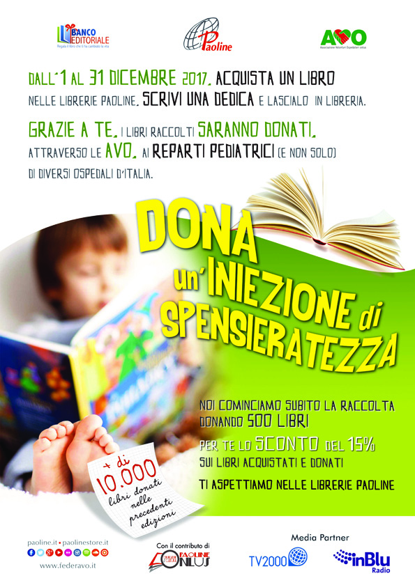 Entrando nelle librerie Paoline, si potranno acquistare libri da lasciare in libreria, che saranno poi donati attraverso le AVO (Associazioni Volontari Ospedalieri) ai reparti pediatrici (e non solo) di diversi ospedali italiani.