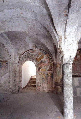 Sotto l’altare maggiore del Santuario, infatti, si cela la sua più antica testimonianza architettonica, con colonnine e capitelli che reggono le volte datate intorno all’anno 1000, alla quale si accede solo attraverso un lungo corridoio che si snoda sotto la navata laterale destra della chiesa.