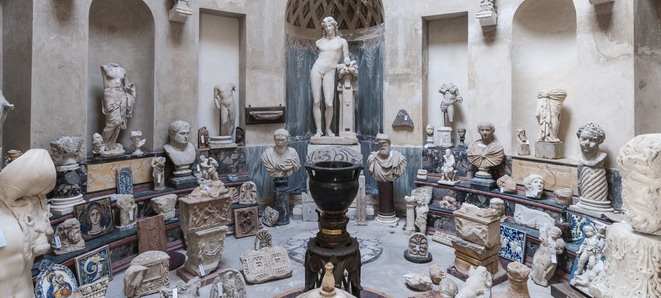 I modelli in gesso di questi battenti, a grandezza naturale, troneggiano proprio nella sala principale della casa-museo al Sacro Monte. Insieme a una serie di altri lavori realizzati da Pogliaghi stesso in oltre settant’anni di attività (morì nel 1950 a 93 anni), “mischiati” a una moltitudine impressionante di opere di svariata e diversissima provenienza: sarcofagi dell’antico Egitto, vasi greci ed etruschi, statue romane, capitelli medievali, sculture rinascimentali, dipinti del Sei e del Settecento. Ma anche bronzi dell’Estremo Oriente, figure lignee indonesiane, e un’eccezionale collezione di tessuti e di tappeti antichi, europei ed asiatici… Oltre duemila pezzi, insomma, allestiti come in una sorta di Wunderkammer, una grandiosa “camera delle meraviglie” che oggi restituisce, il più fedelmente possibile, i percorsi e le atmosfere ideati dallo stesso Pogliaghi.