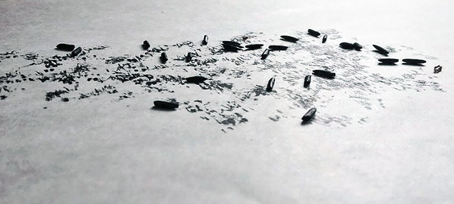 Con l’opera I giorni, Silvia Inselvini, segnalata dai curatori del Premio, presenta un lavoro che nasce da un lungo percorso di riflessione, come se fosse la messa in atto di un rituale. Due grandi stampe fotografiche riproducono i cento fogli di carta semitrasparente sui quali l’autrice ha fatto in modo che i singoli chicchi di riso, da lei intinti nell’inchiostro e poi passati sulla carta, lasciassero traccia della pressione esercitata. Accanto alle stampe fotografiche, da un lato una scatola di carta contiene i fogli che hanno accolto il passaggio della mano e del riso, mentre dall’altro lato, gli stessi chicchi di riso, anneriti, si fanno testimonianza del lavoro compiuto. Il gesto assume un ruolo fondamentale: giorno dopo giorno, la ripetizione dell’azione diventa meditazione sul senso del nostro agire, che come il ripetersi di una preghiera si fa denso di senso. Si tratta dunque di una mostra tanto «silenziosa», quanto intensa e profonda nella sua capacità di farci riflettere su alcune dimensioni fondamentali del mondo di oggi. (A.D.)