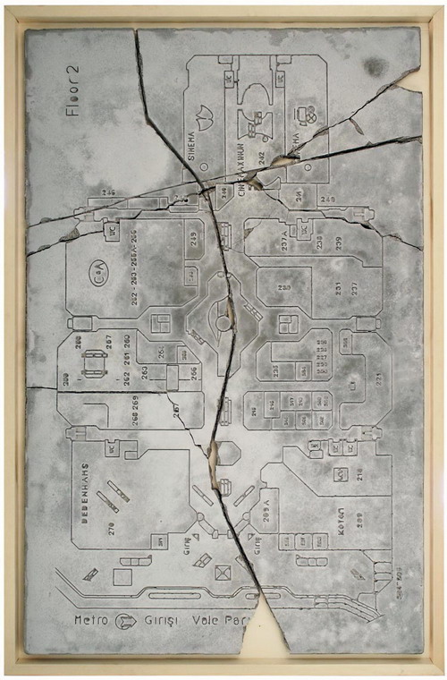 Andrea Francolino, vincitore del Premio San Fedele giovani artisti 2014, realizza piante di centri commerciali che si presentano come reperti archeologici, con crepe e fenditure lasciate dal tempo. Da un lato esprimono l’attualità del nostro tempo presente, presentandoci luoghi oggi molto noti e affollati, dall’altro dichiarano una storia passata, facendo emergere come tutti gli spazi in cui si celebra un rapido e affrettato «consumo» siano destinati a svanire nel tempo, a perire, a dissolversi. Non solo, Francolino crea scaffali pieni di prodotti sbiancati, che paiono giungere a noi come da un tempo indefinito. Quasi fossero statue antiche, sembrano posti in un qualche scaffale della nostra memoria, rivelandosi come oggetti di un tempo perduto di cui sono consegnate pallide ombre.