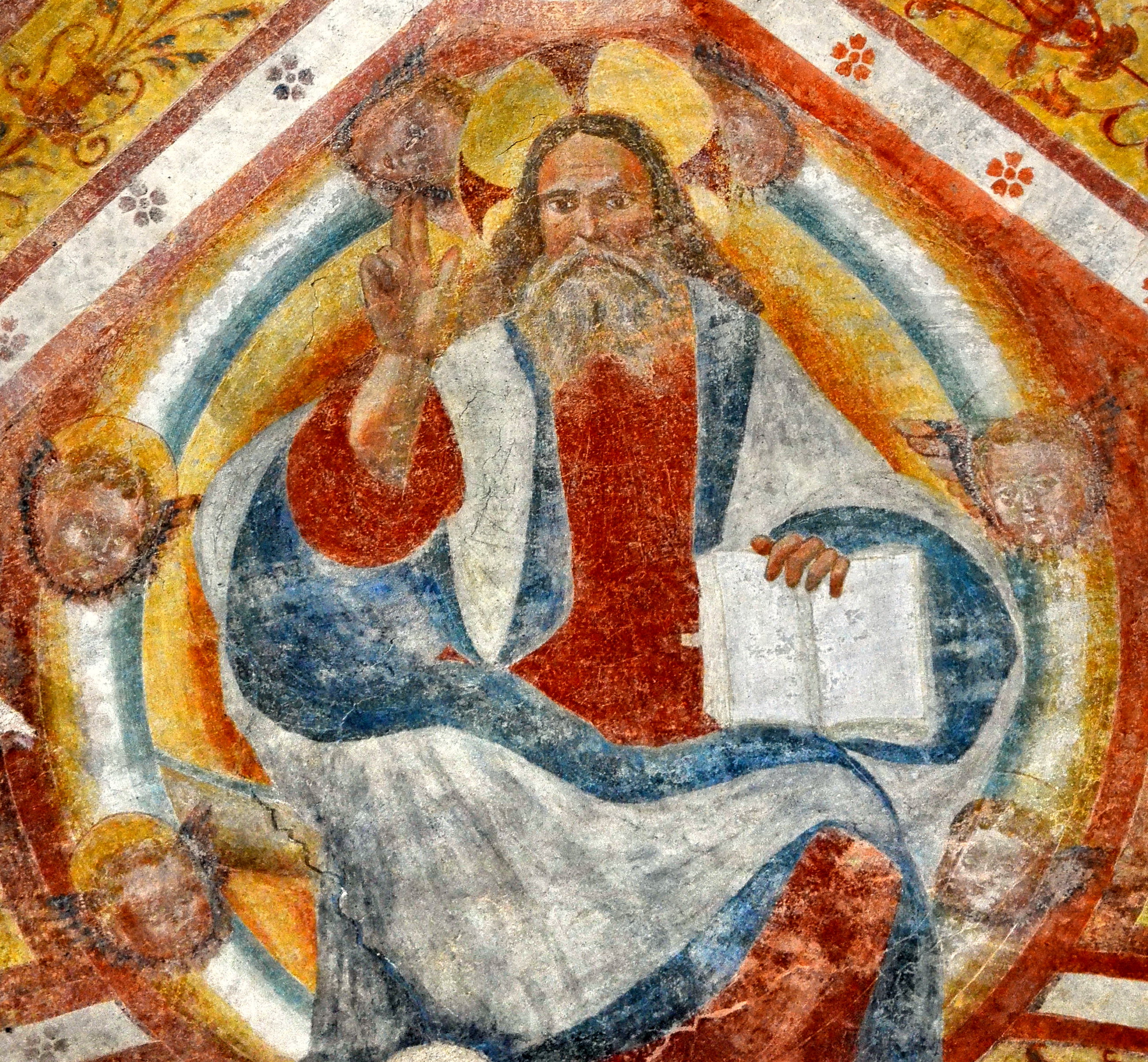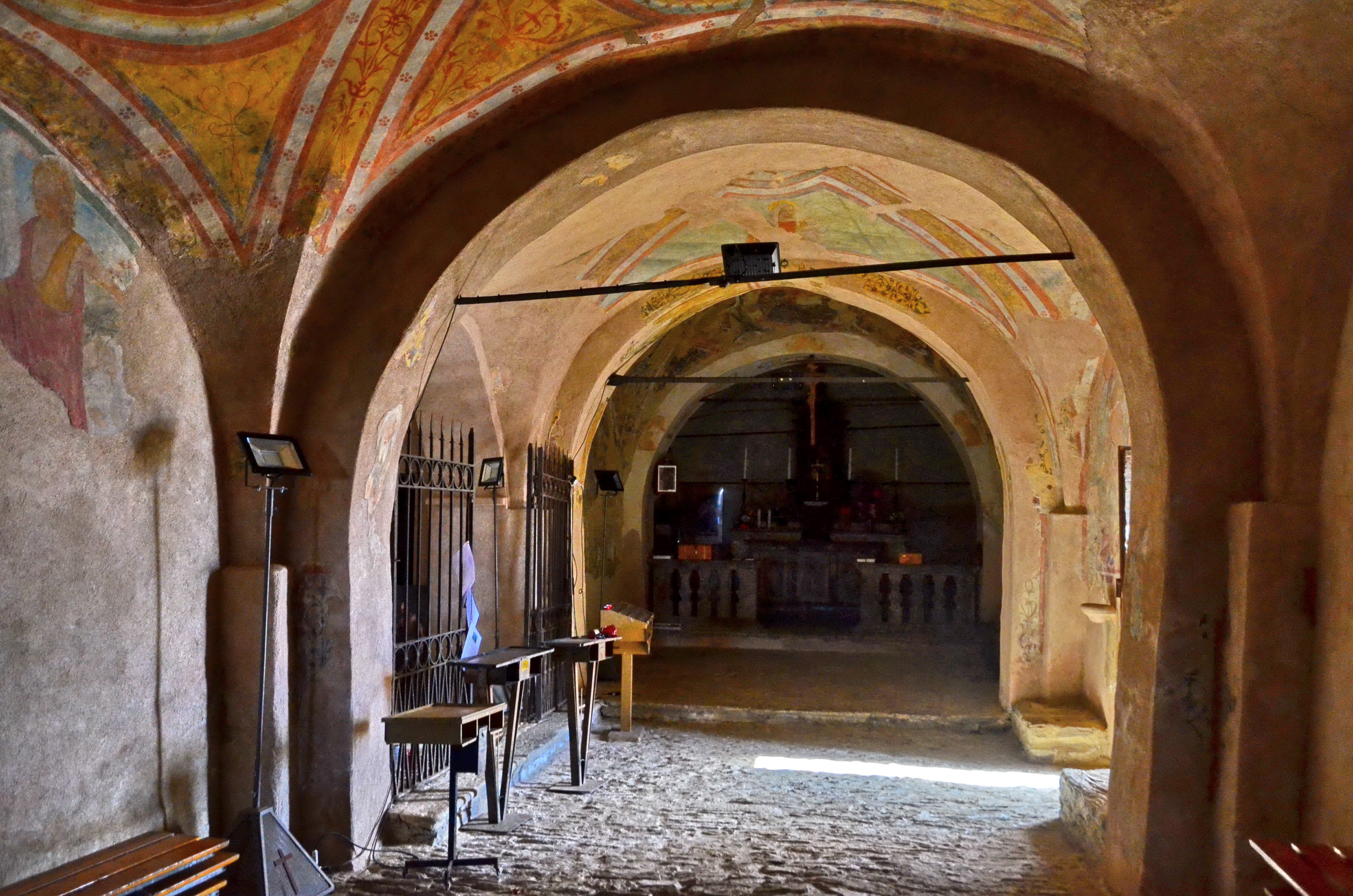 Si tratta di dipinti realizzati per lo più nel XV secolo, con aggiunte e integrazioni successive, che ricoprono quasi per intero le pareti e le volte dell’oratorio: pitture semplici, popolaresche persino, anche se non prive di una certa eleganza, che puntano molto sull’espressività dei gesti e sulla vivacità dei colori. Come il Padreterno che, sulla volta, benedice i fedeli giunti fin quassù con uno sguardo che, nella penombra della chiesa, brilla di benevola accoglienza…