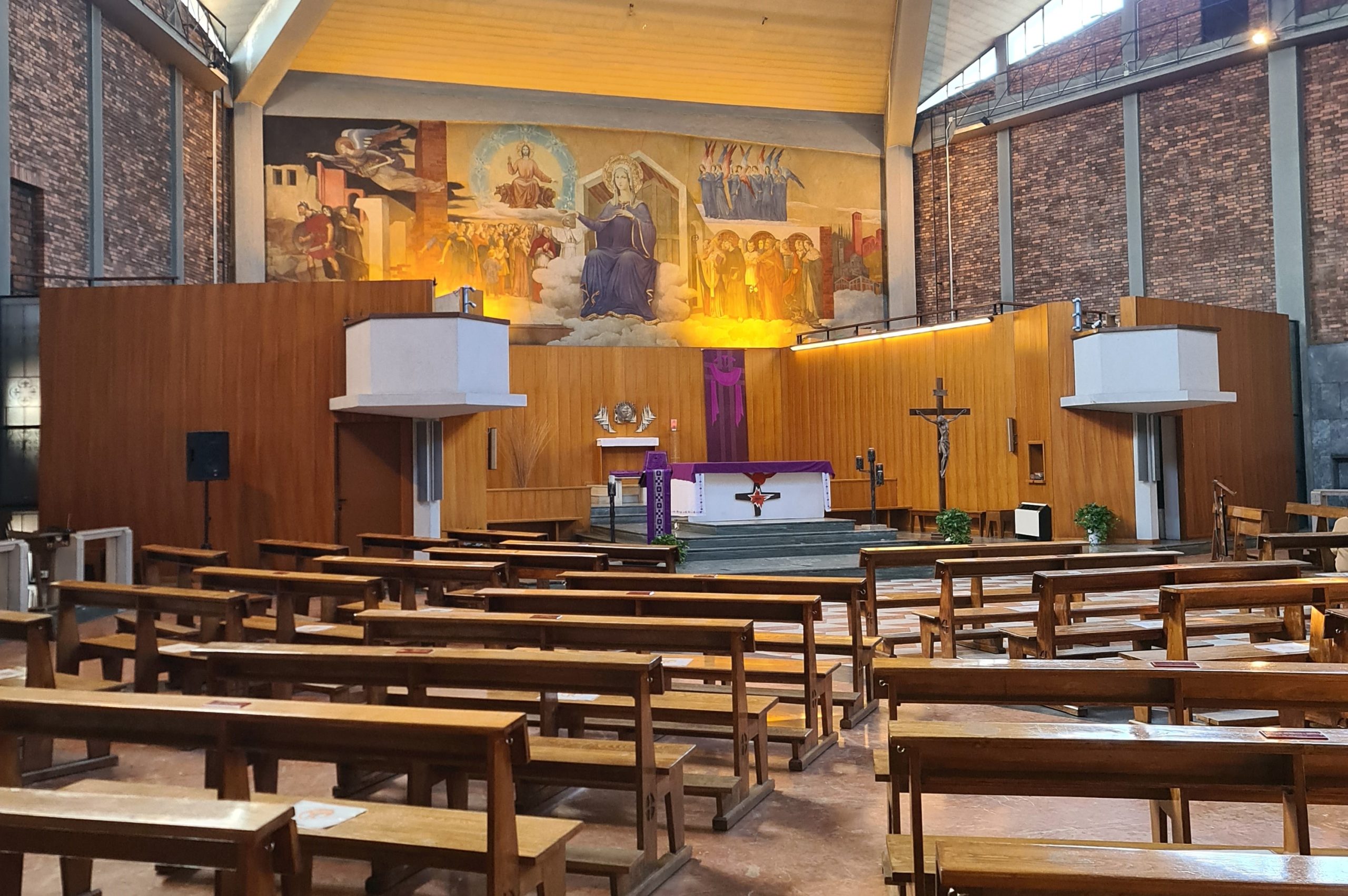 Del progetto fu incaricato l’architetto Ezio Cerutti, che ideò un edificio semplice, funzionale, senza inutili fronzoli, ma soprattutto luminoso e accogliente: una chiesa priva di colonne e «impedimenti» (anche soltanto «visivi»), dove l’assemblea potesse ritrovarsi a celebrare come comunità, nella gioia riconoscente. E dove lo sguardo corresse sulla grande parete di fondo, dietro e sopra l’altare, affollata di figure come una parete di Raffaello: per fermarsi, lo sguardo, come calamitato, sul volto di Maria. Ma che questa volta appare sorridente, rassicurante, dolcissimo. Eccola, la Liberatrice. Colei che il monaco benedettino aveva conosciuto ben prima di diventare vescovo di Milano, avendola invocata già a Roma, nel suo santuario del Testaccio.