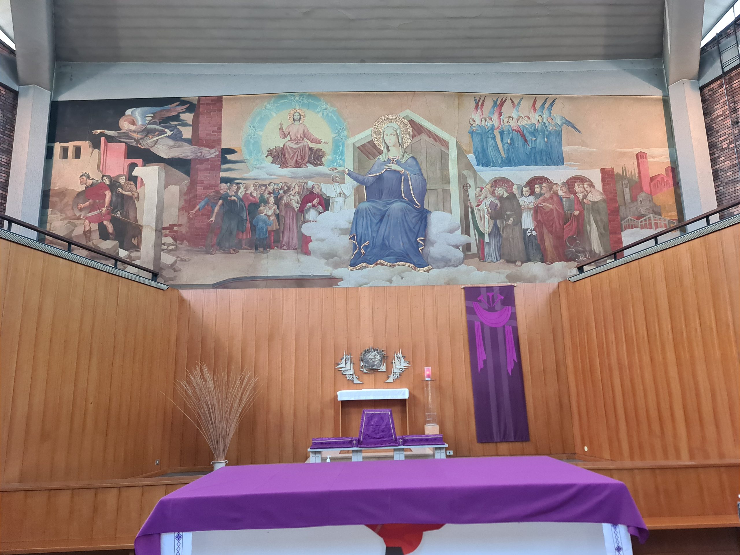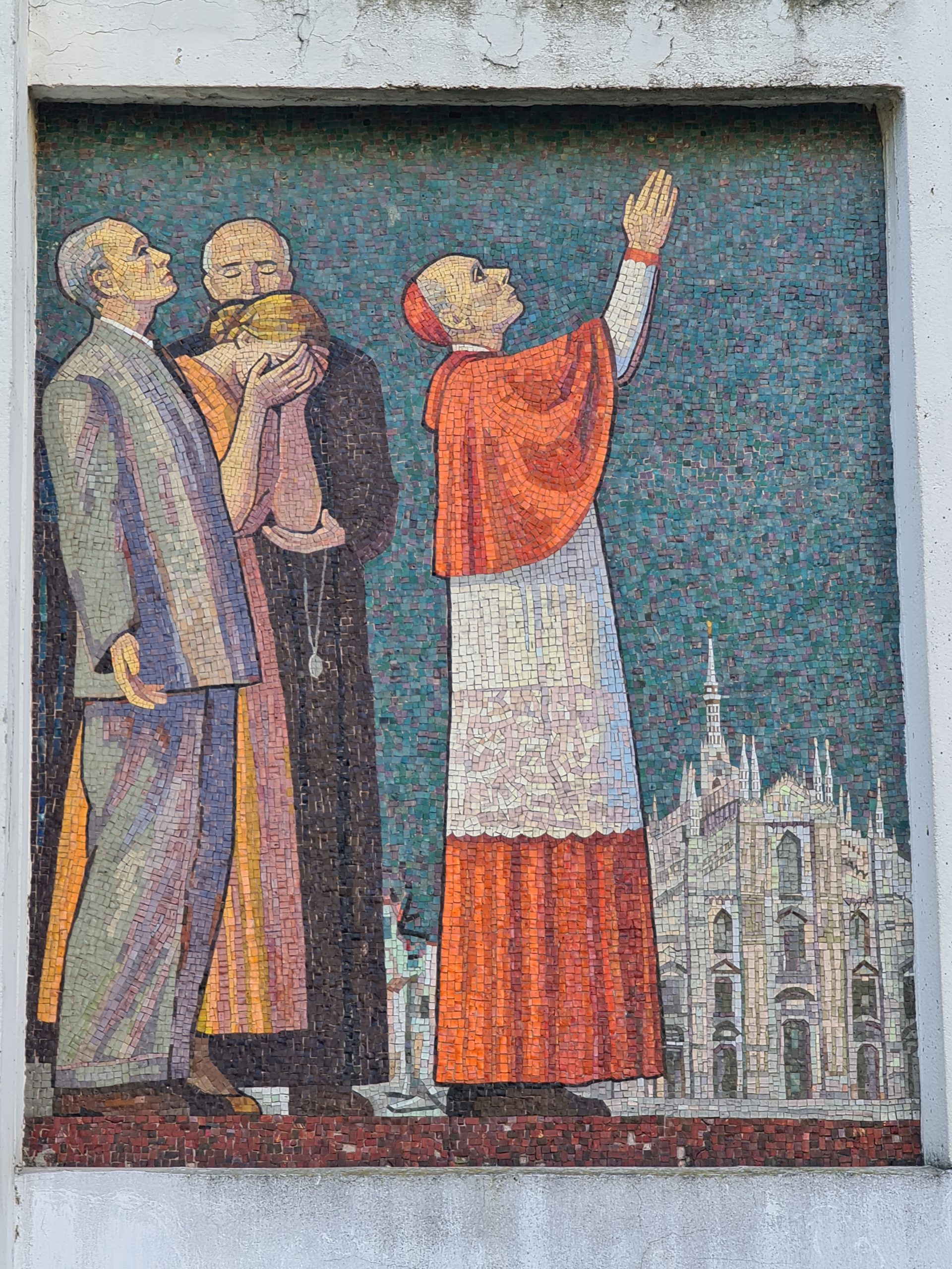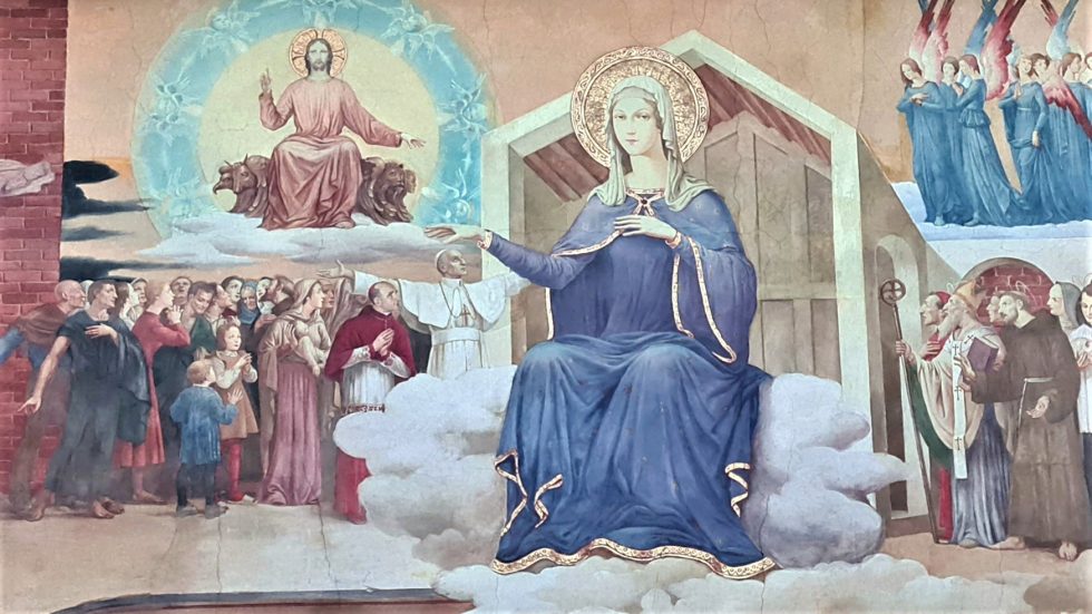 Tutti si volgono a Maria, ma la Madre stende la sua mano protettrice dall’altra parte, sulla testa del pontefice regnante all’epoca della stesura di questo ciclo, Pio XII, con le braccia spalancate come lo ha immortalato una celebre foto, tra la gente del quartiere romano di San Lorenzo, appena bombardato: Pacelli che proprio in quel 1958 ebbe a terminare il suo viaggio terreno. E sotto di lui il suo segretario di Stato del tempo di guerra, l’arcivescovo di Milano, il futuro Paolo VI, papa santo: Giovan Battista Montini, in un delicato ritratto.
