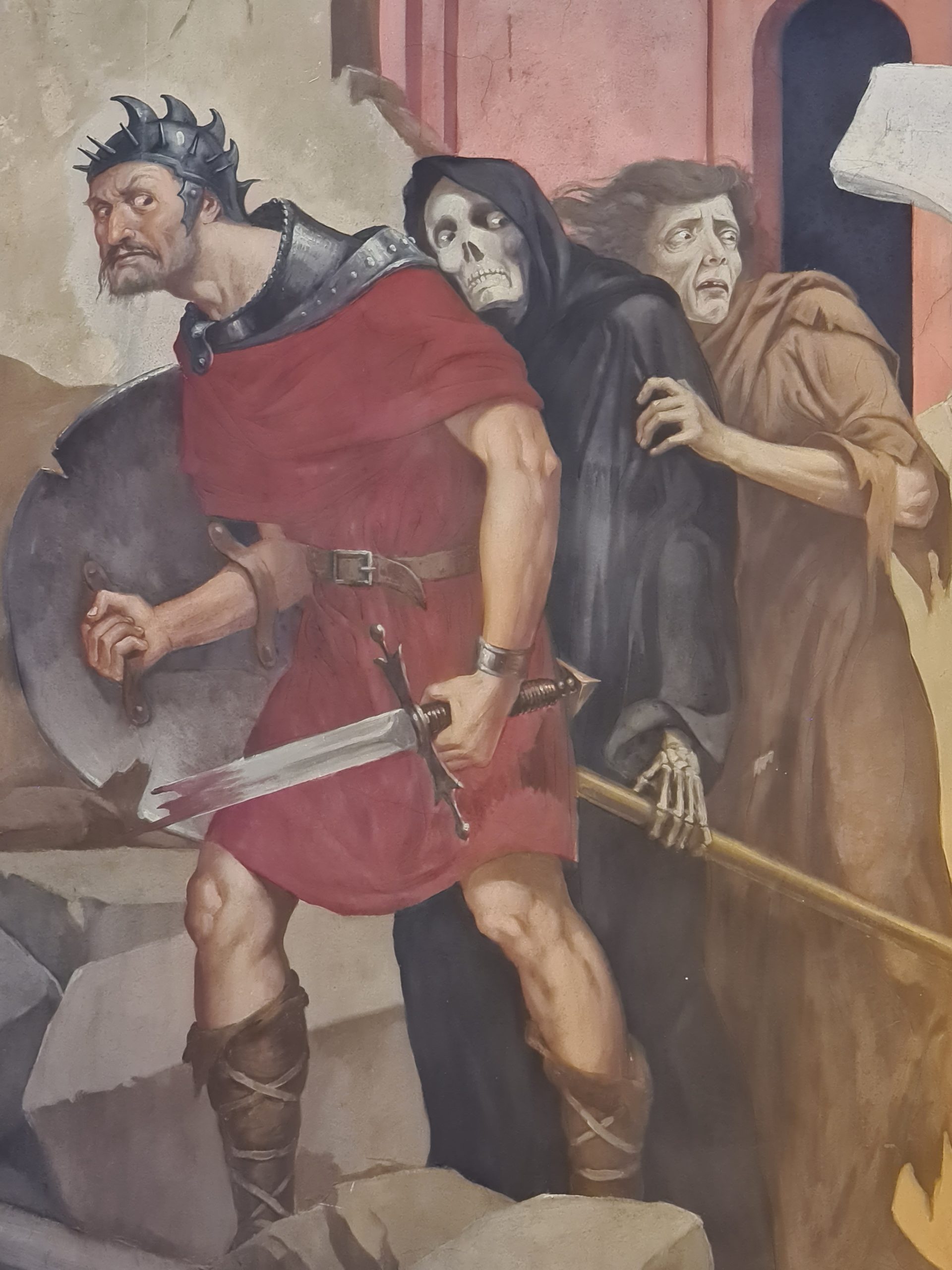 È qui che attende fiducioso il popolo tutto di Dio: gente umile per lo più, padri e madri di famiglia con i loro fanciulli, in maniche di camicia e giacche sbottonate. Sulle loro teste la gloria del Signore, assiso sul Tetramorfo. Mentre alle loro spalle fuggono scacciate dalla divina potenza le personificazioni tragiche e grottesche della guerra, della morte e della fame: apocalittico trio che Compagnoni dipinge con efficacia e potenza espressiva.